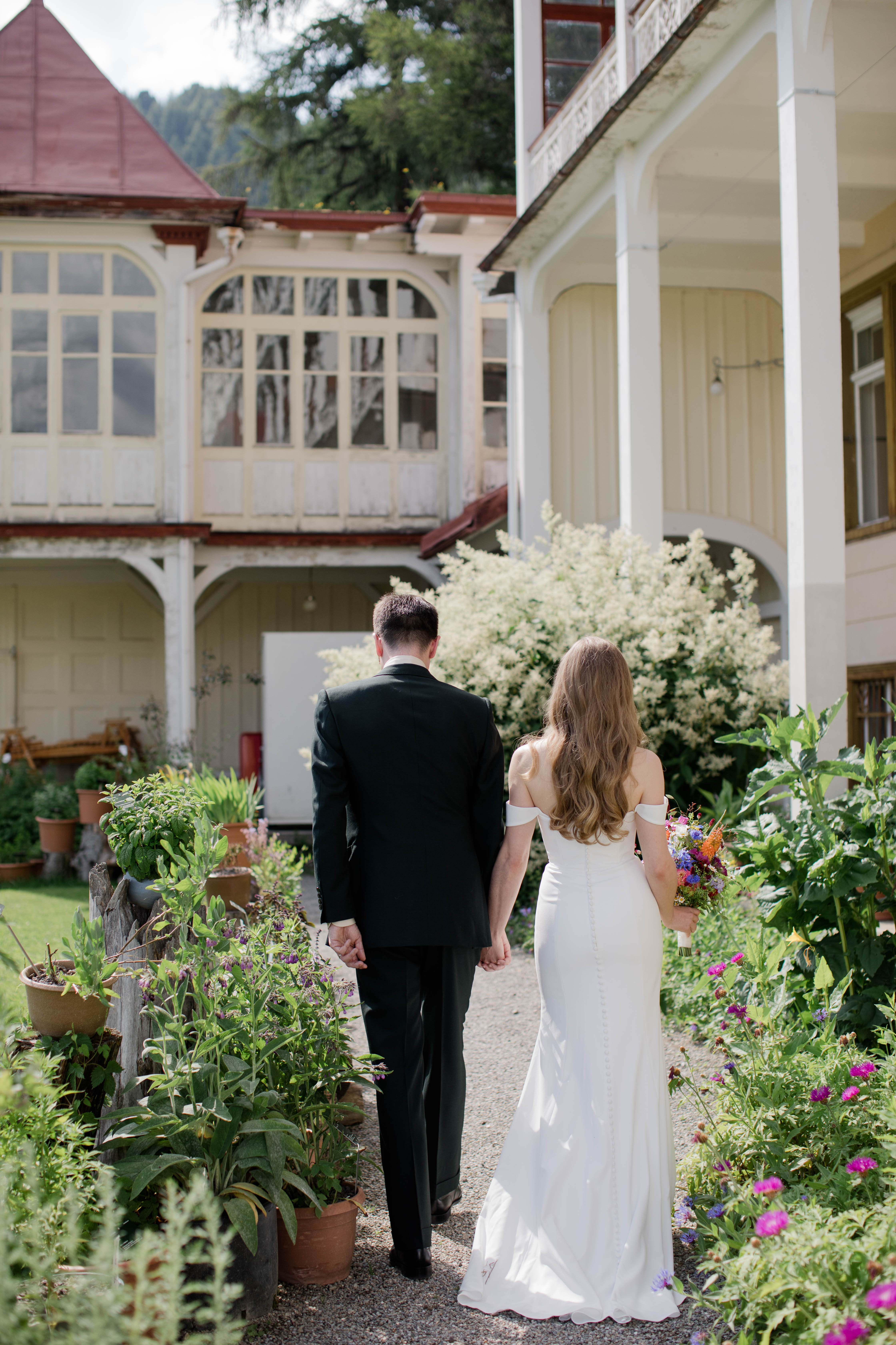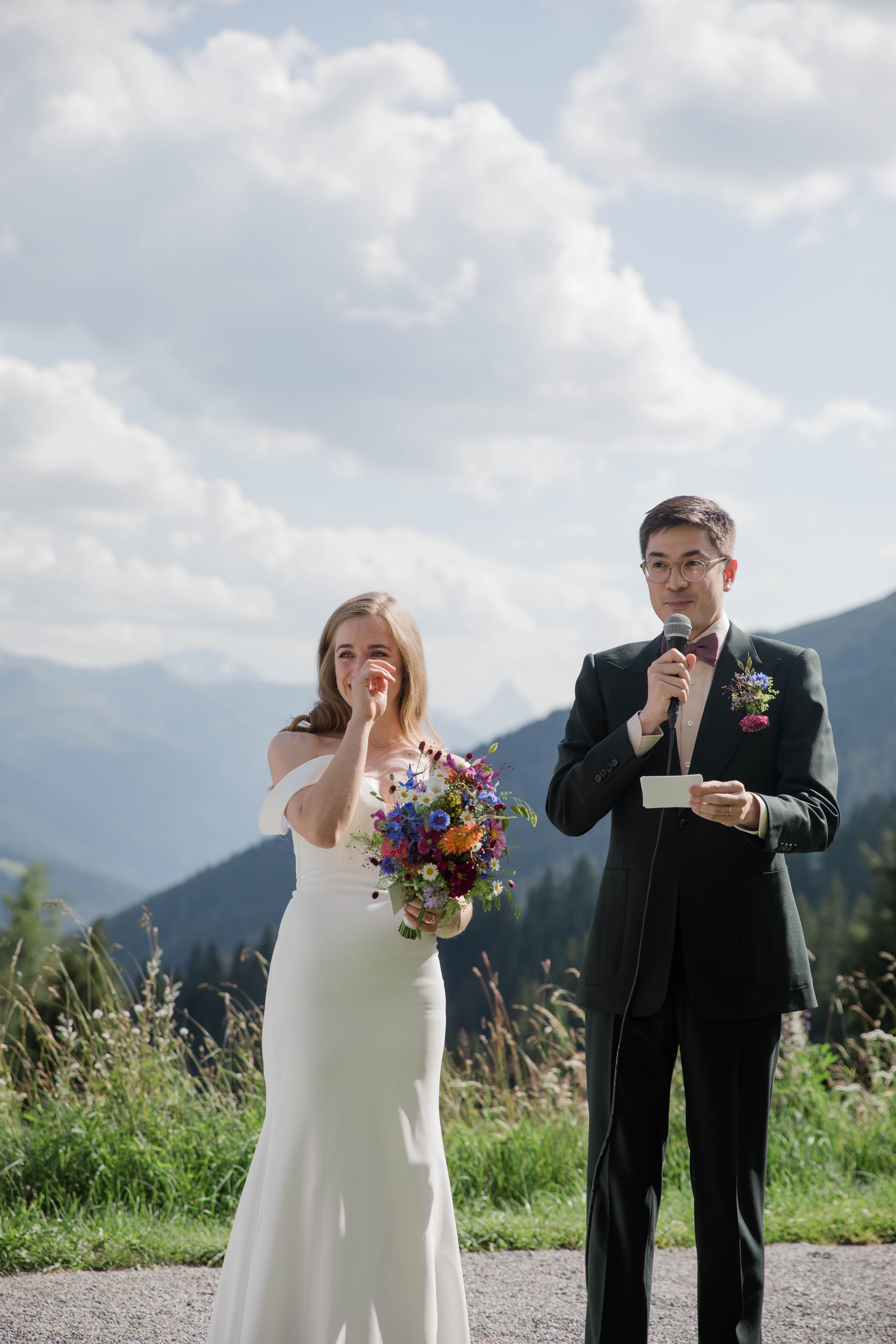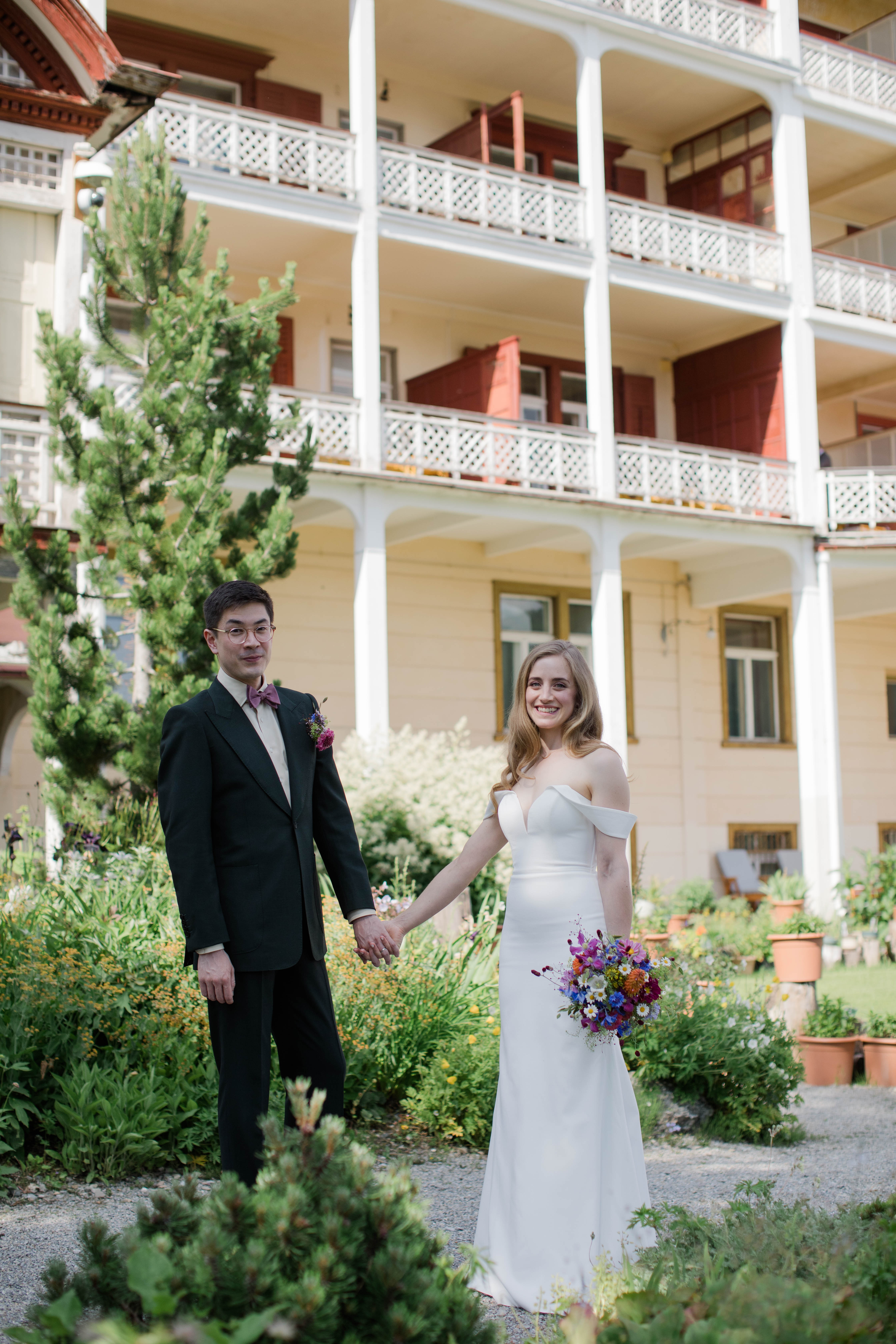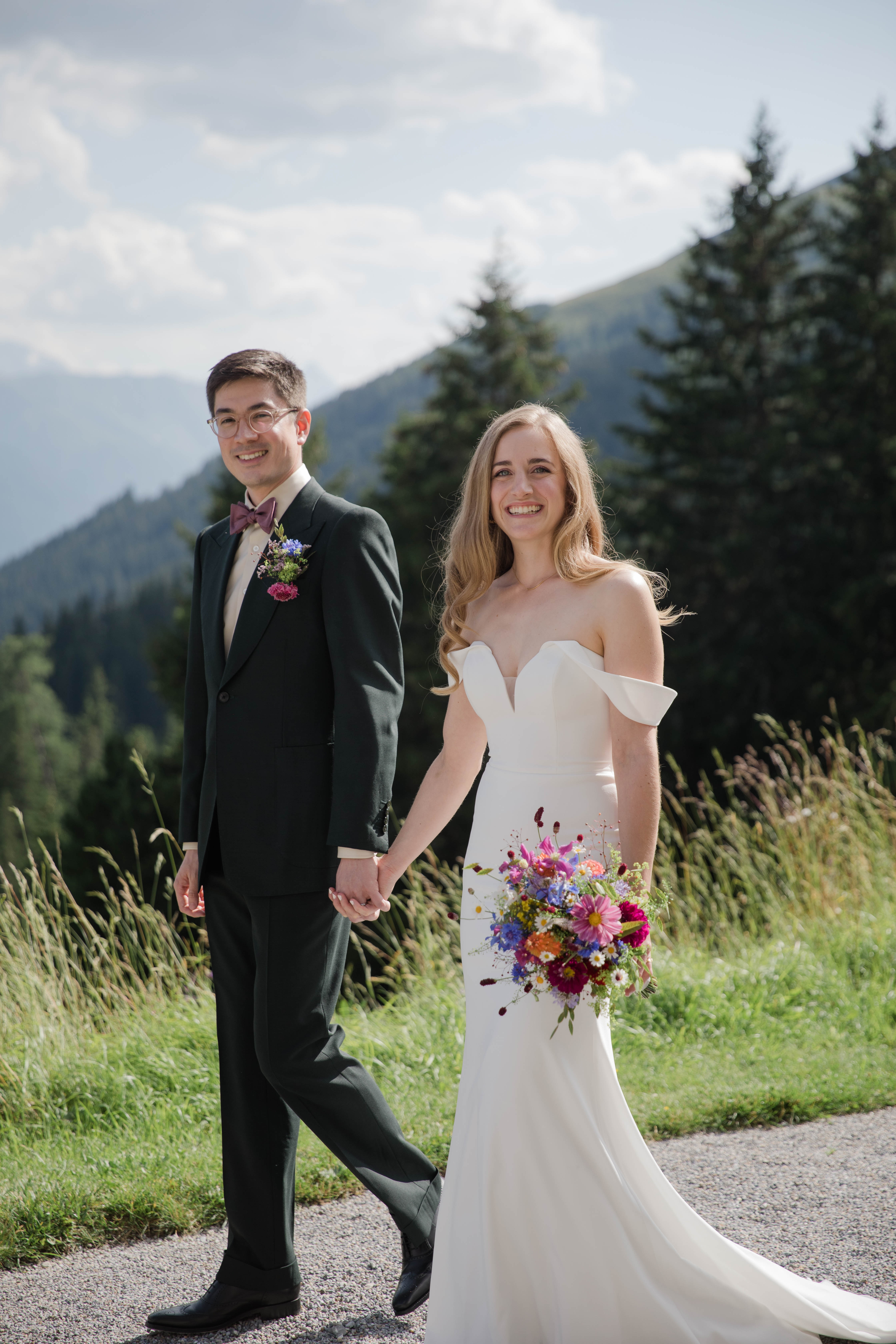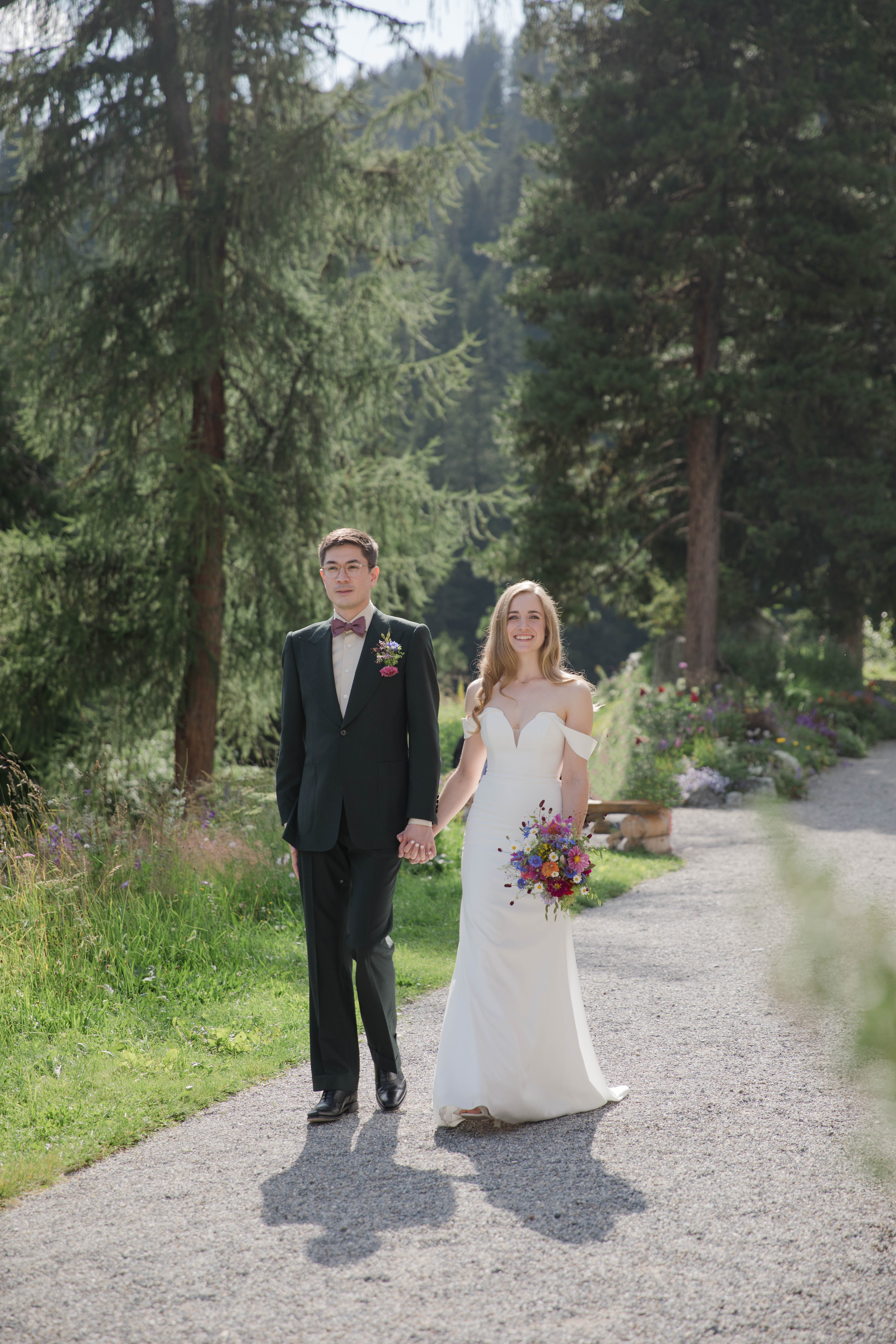 The couple captured stunning portraits in the hotel’s picturesque garden, with the majestic Alps providing a breathtaking backdrop. Inside, the hotel itself was a testament to the bride’s aesthetic, every corner reflecting the vintage symmetry and whimsical charm of an Anderson film. It was a truly magical experience, as if we were living inside a work of art.