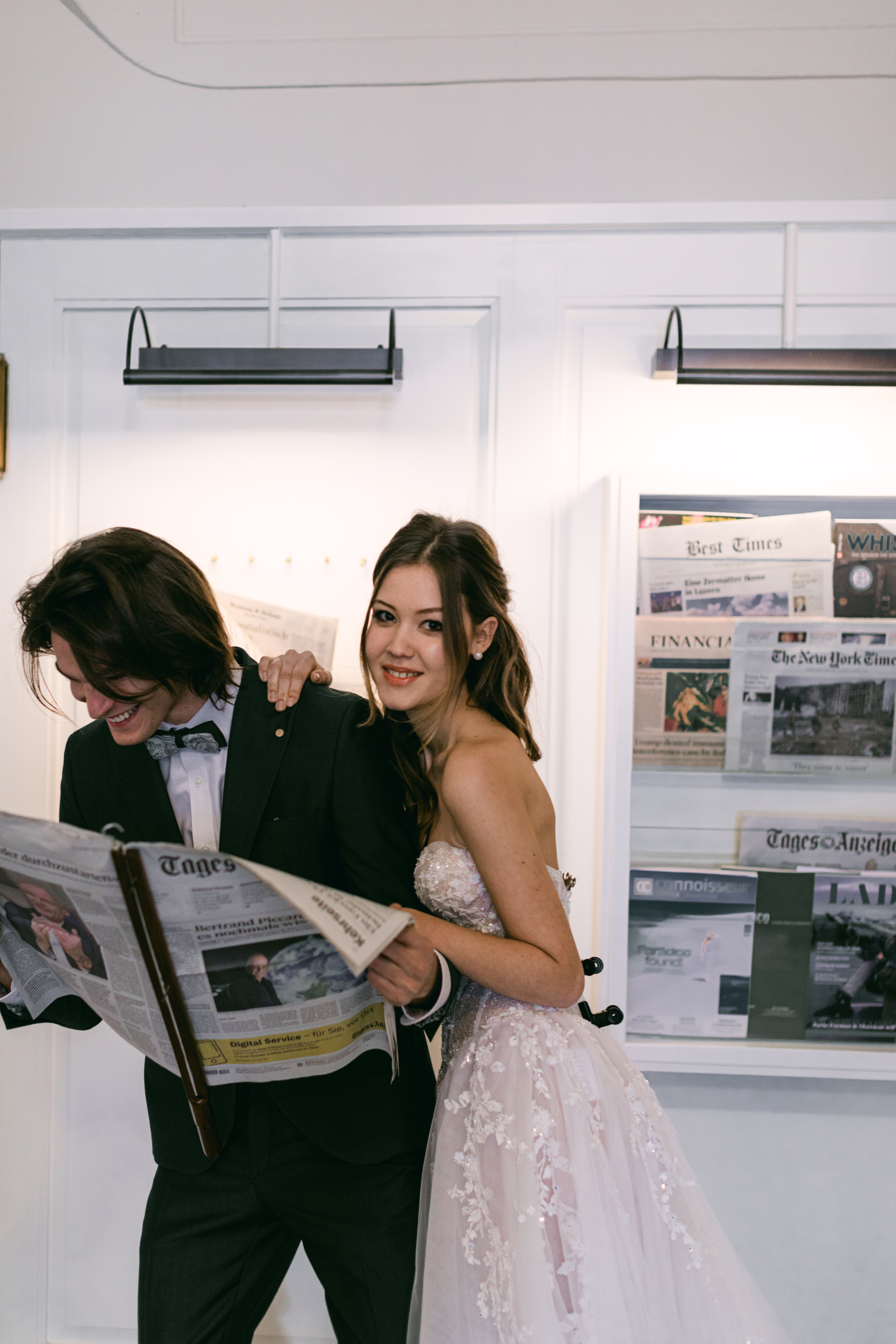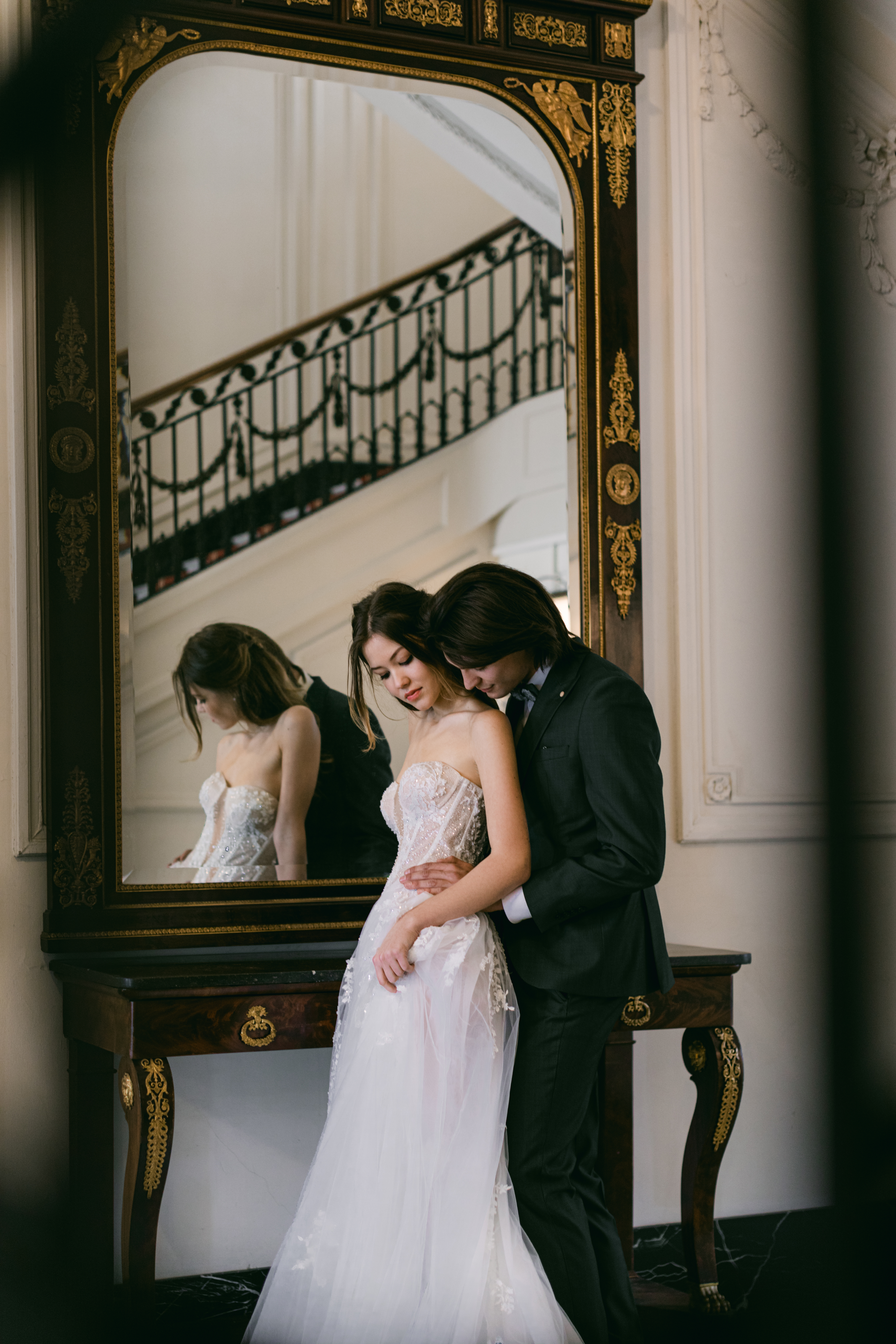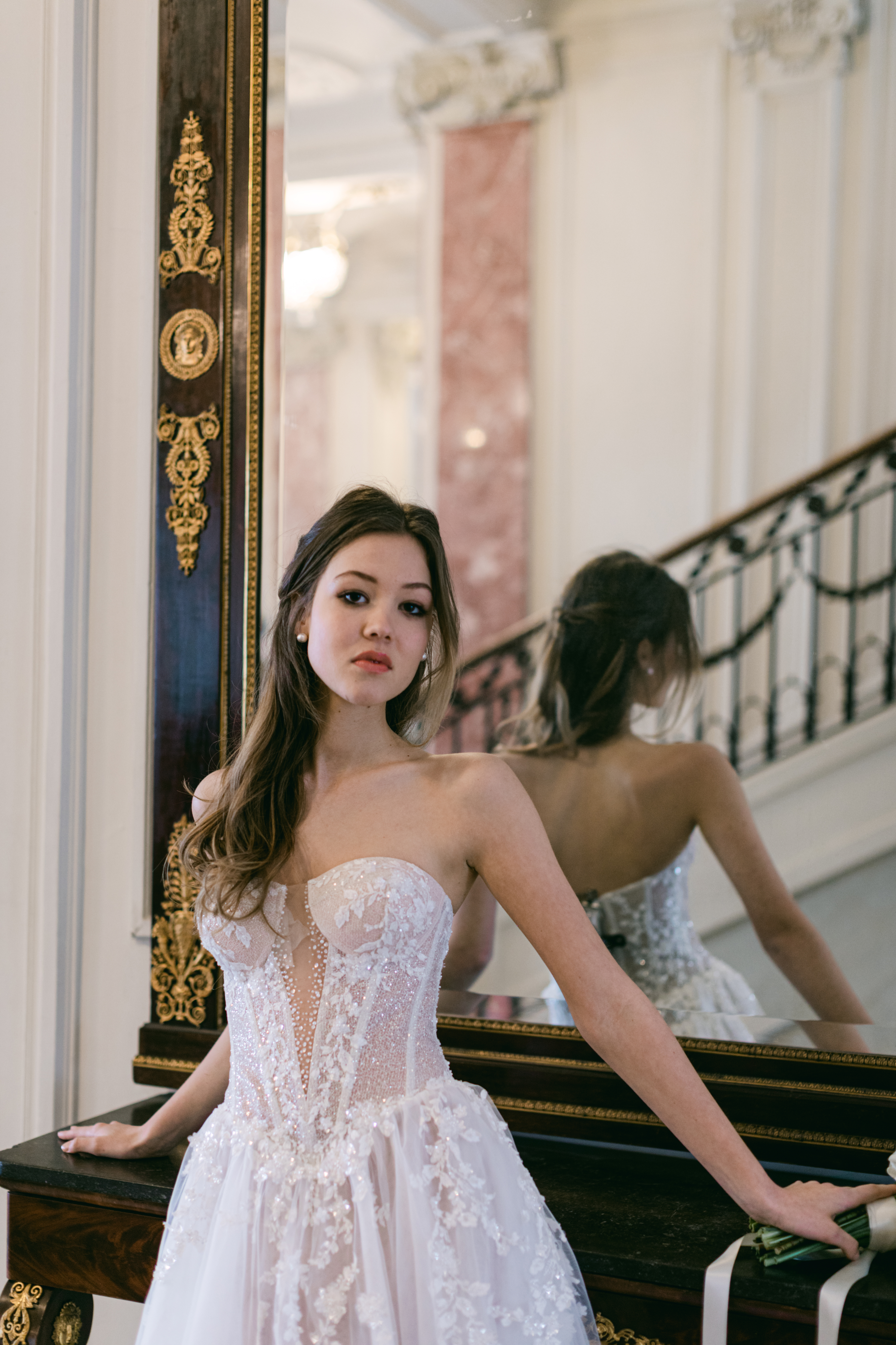 This is a styled shoot we planned at the Grand Hotel National Luzern, a historic luxury hotel renowned for its elegant architecture and stunning views of Lake Lucerne. To complement the hotel’s opulent setting, we chose a lavish, beaded wedding gown with a long train.