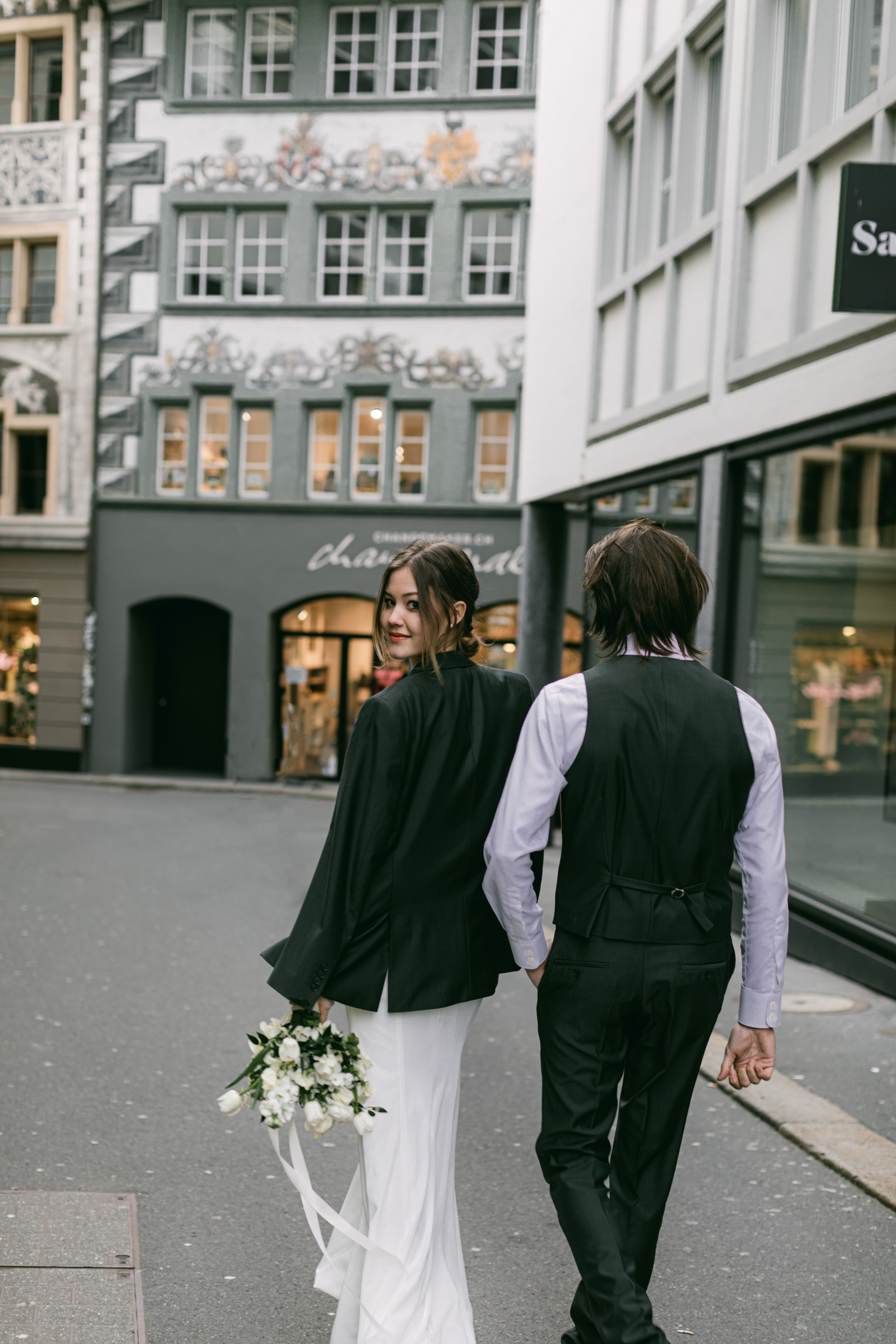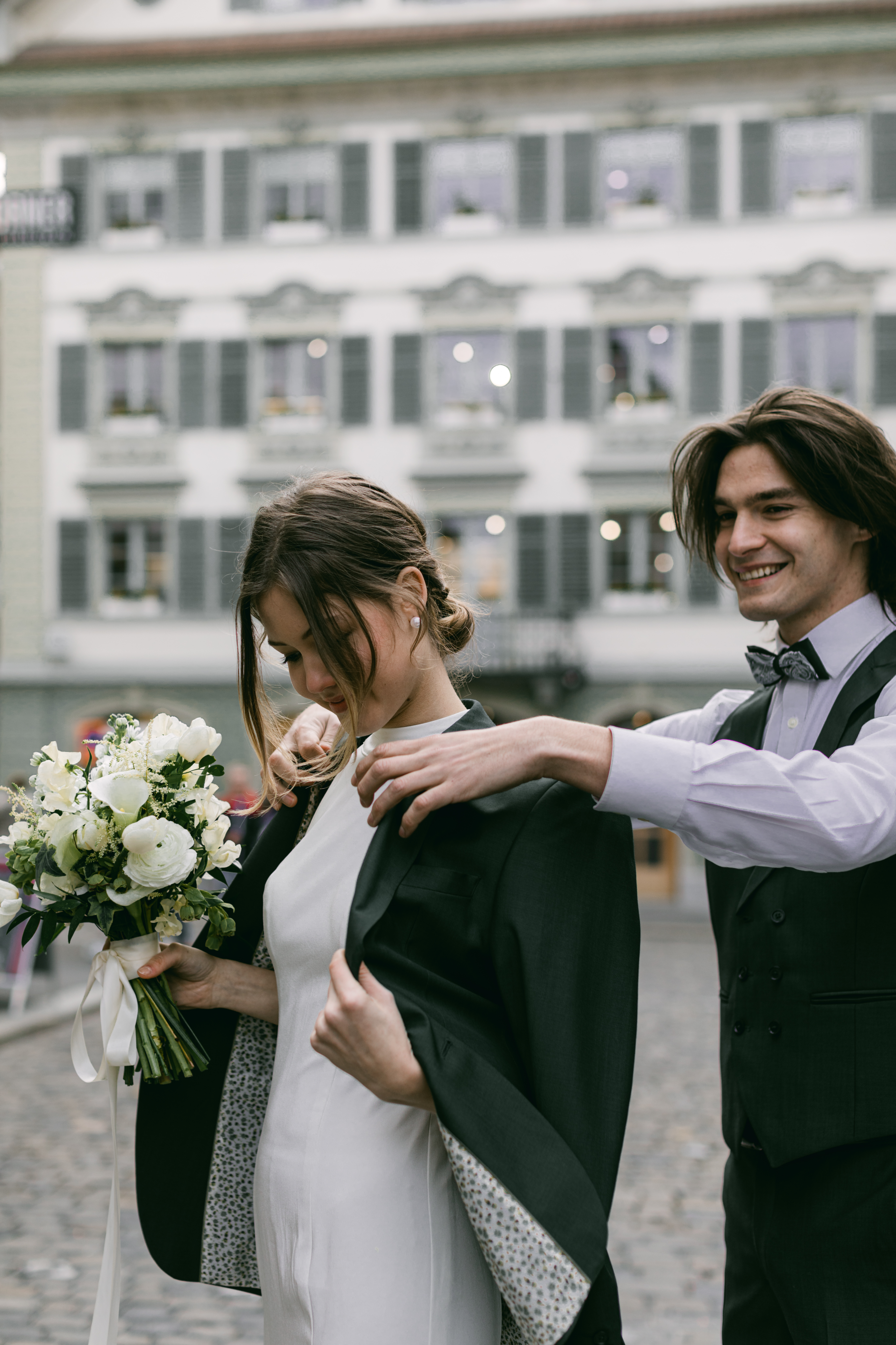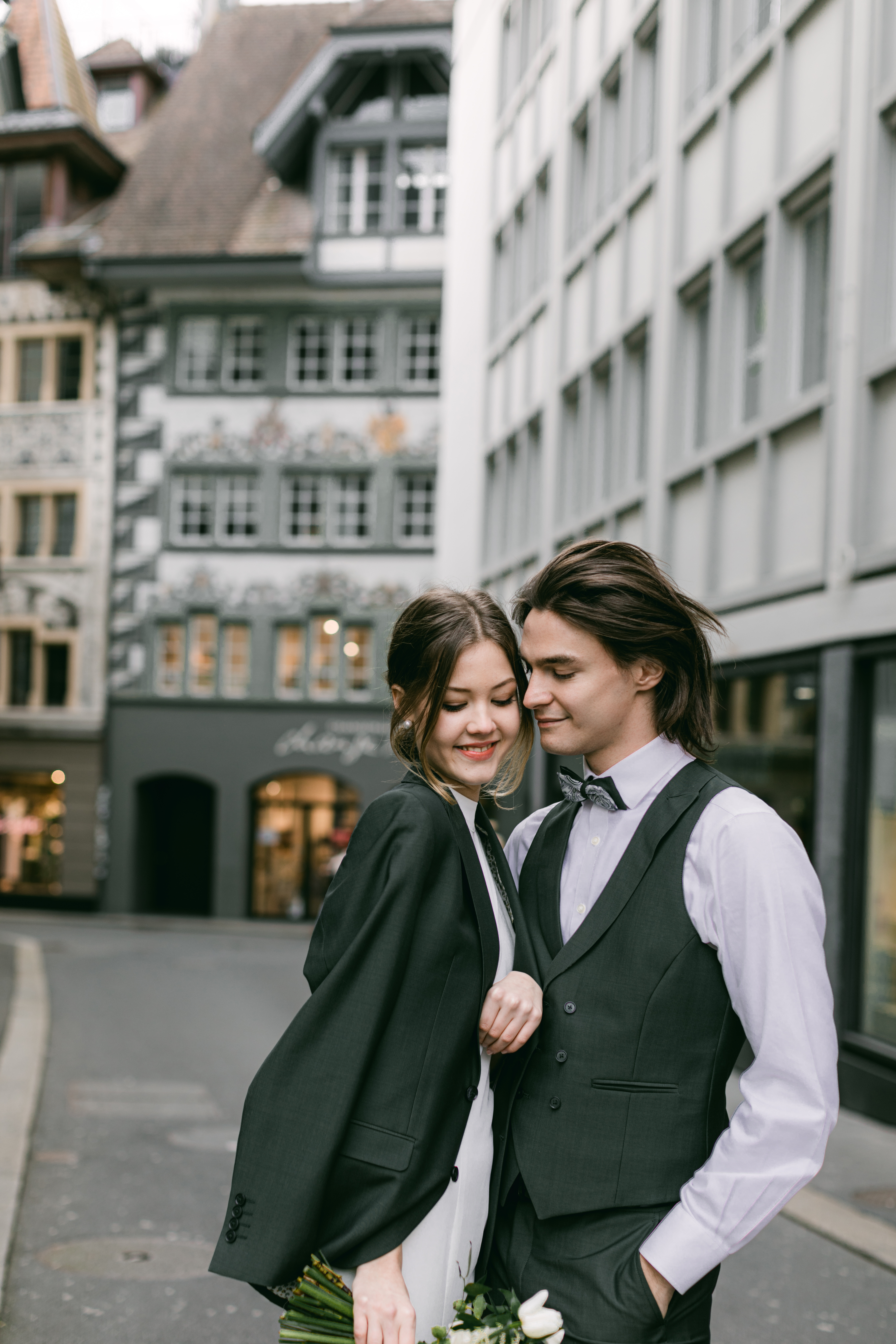 After capturing the indoor scenes, we ventured out into the city of Lucerne for additional outdoor shots. The weather was quite cold, so the bride wore the groom’s suit jacket, which surprisingly complemented her outfit very well. For the outdoor shots, we opted for a more simple and elegant wedding dress that accentuated her figure.