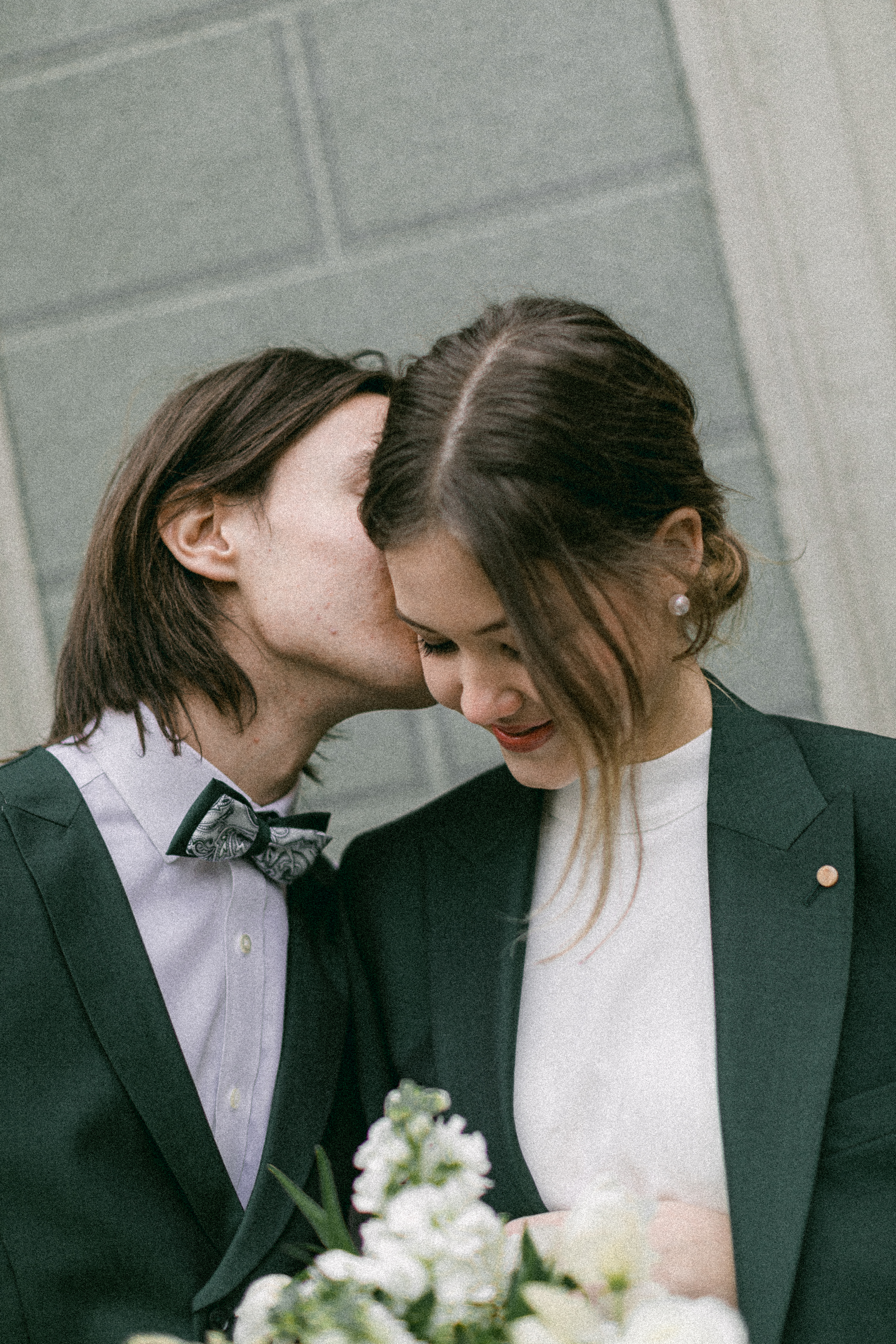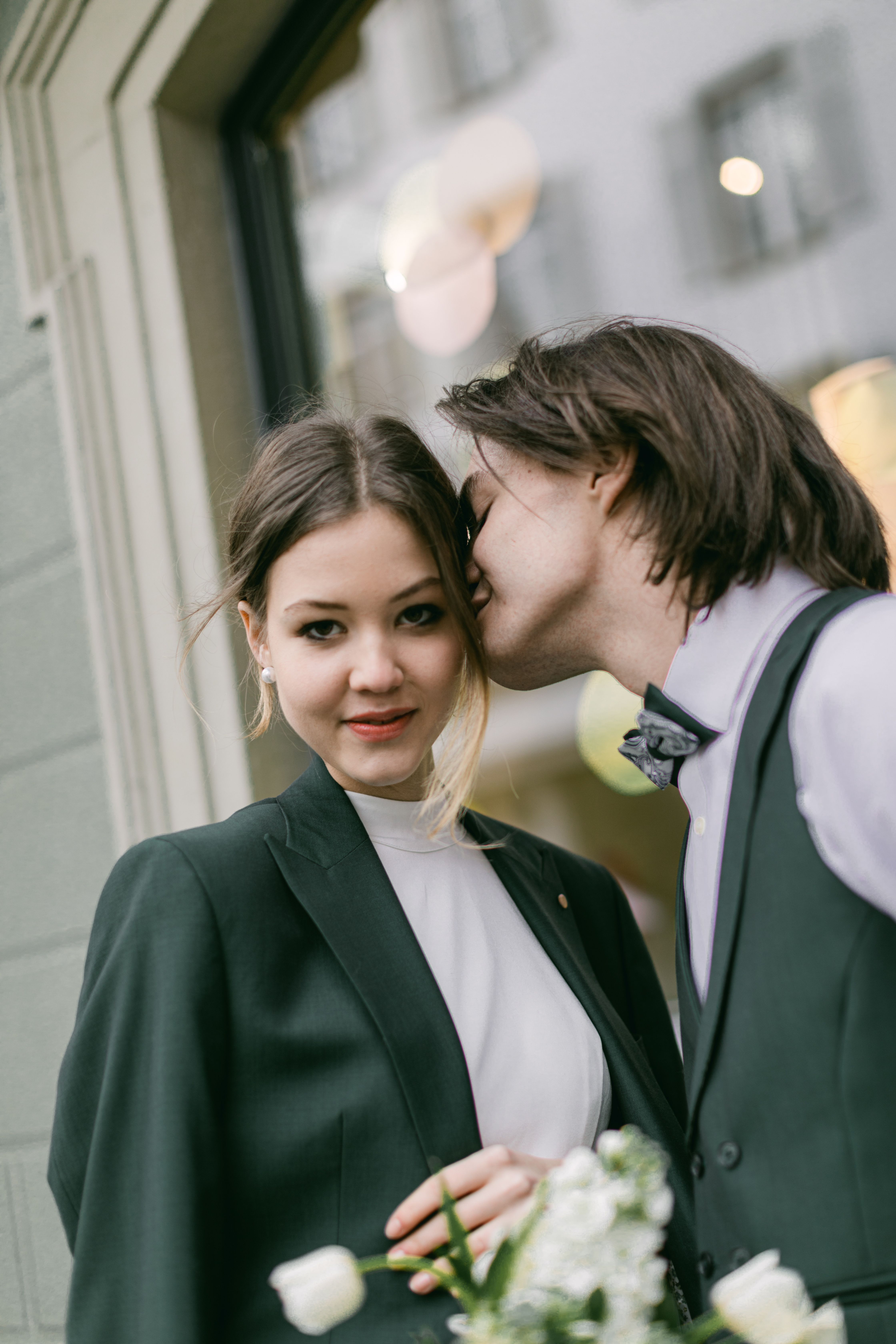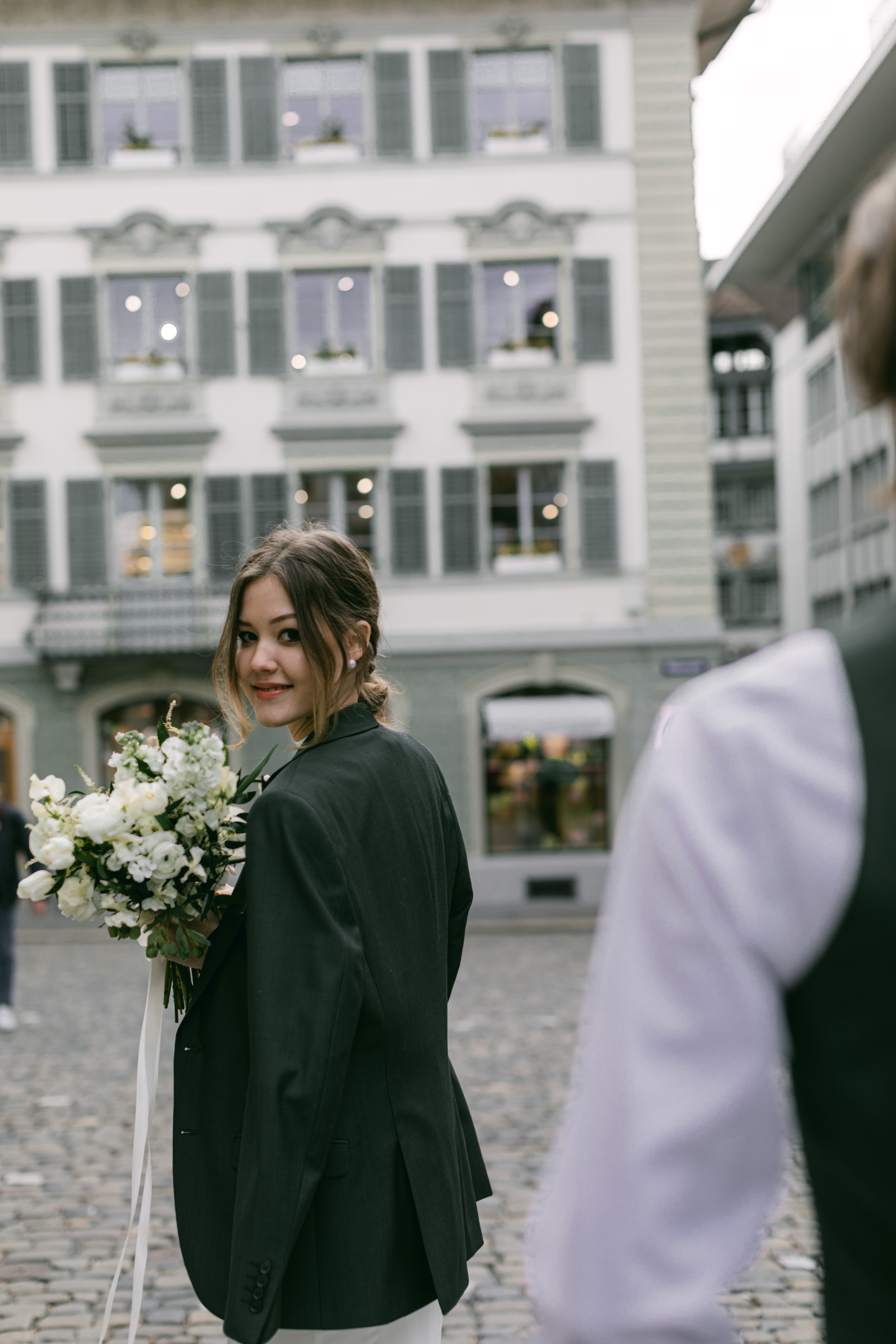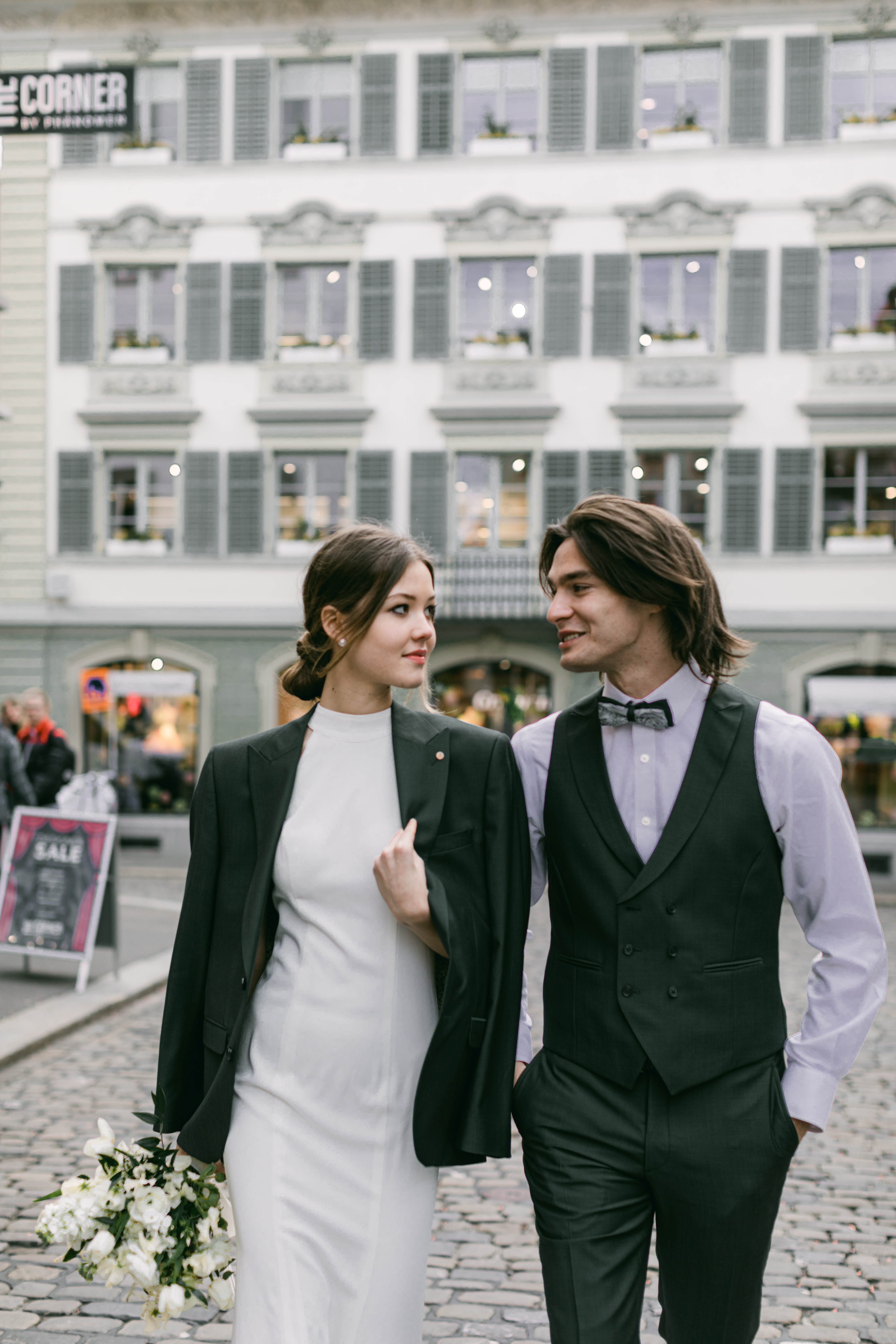 After capturing the indoor scenes, we ventured out into the city of Lucerne for additional outdoor shots. The weather was quite cold, so the bride wore the groom’s suit jacket, which surprisingly complemented her outfit very well. For the outdoor shots, we opted for a more simple and elegant wedding dress that accentuated her figure.