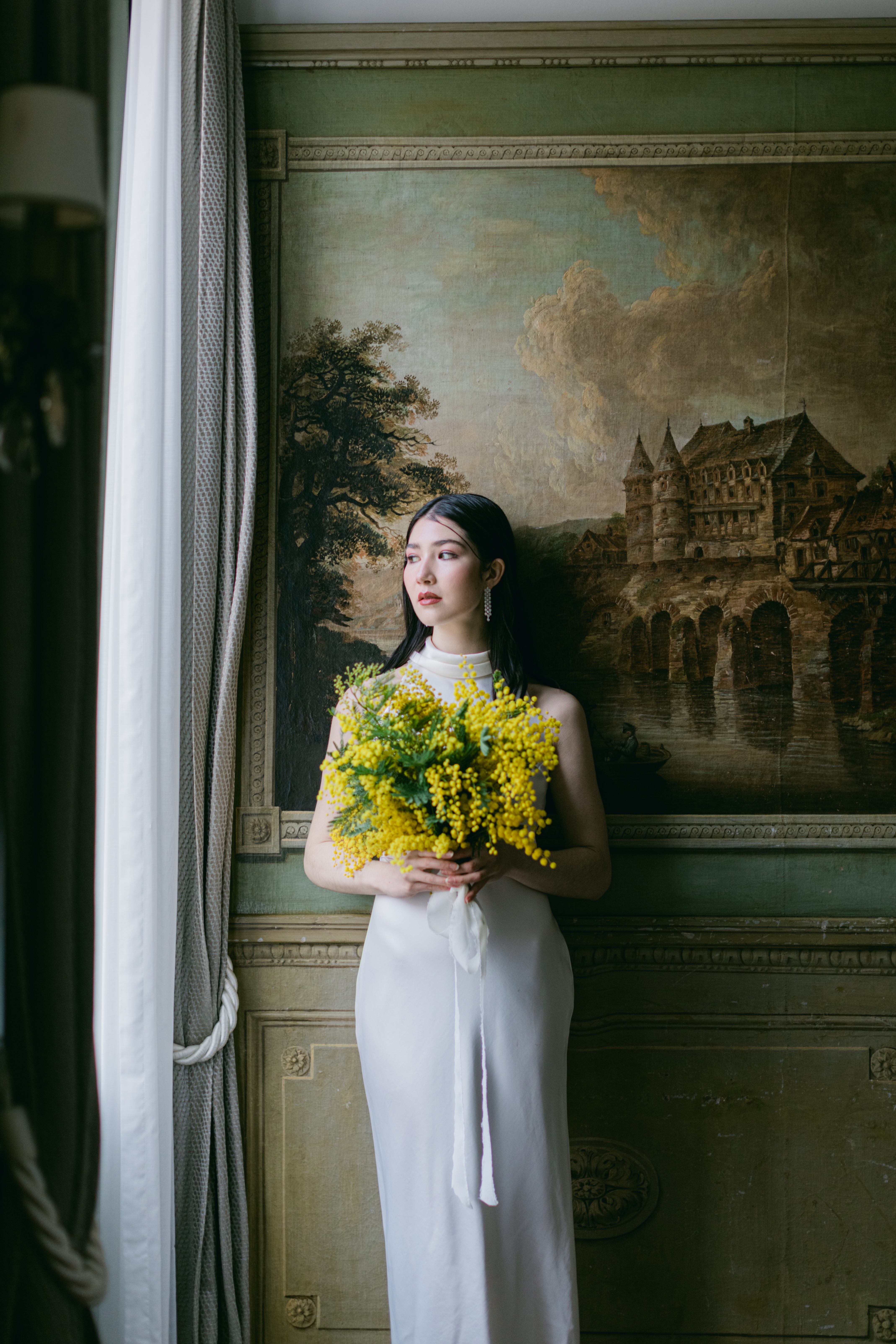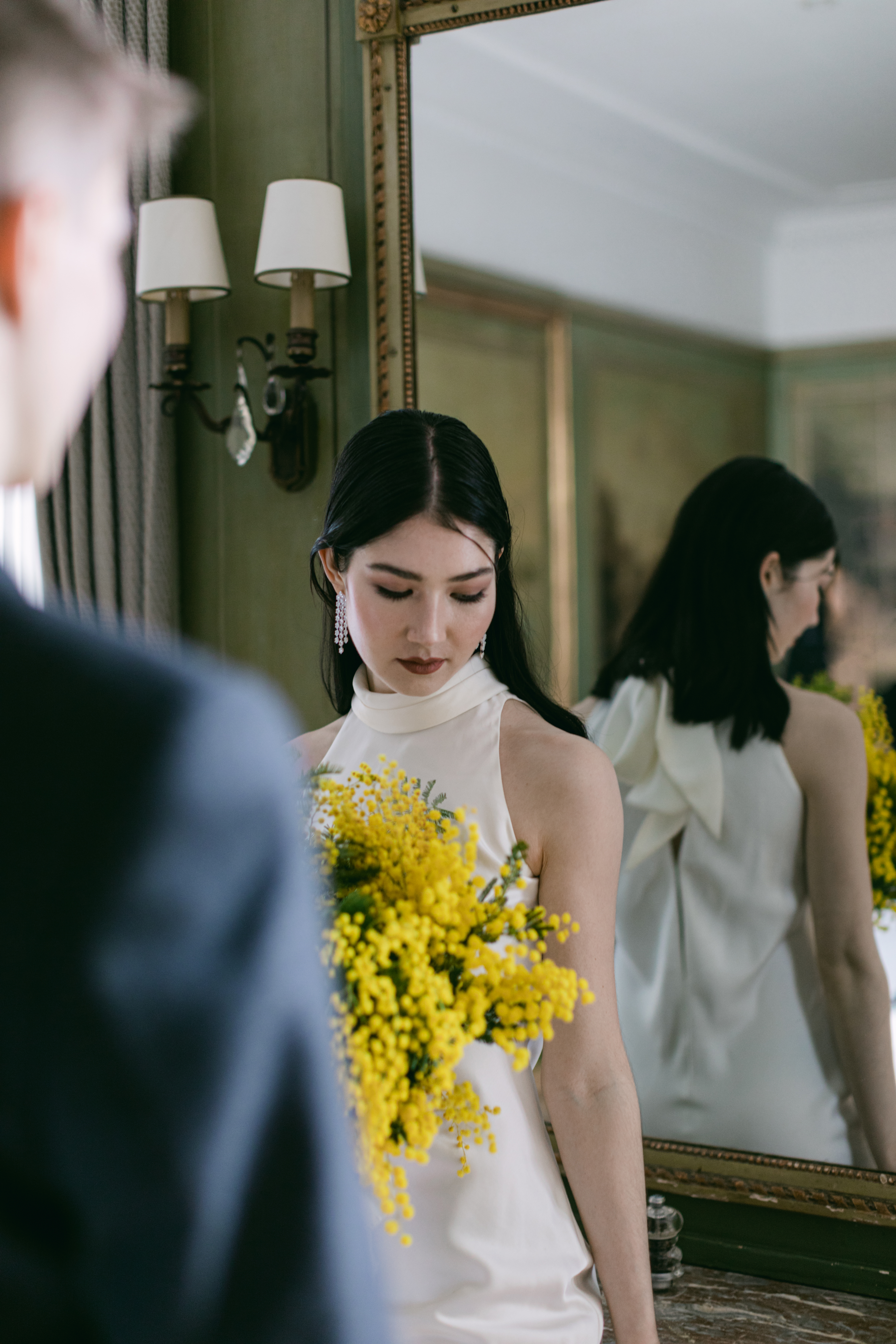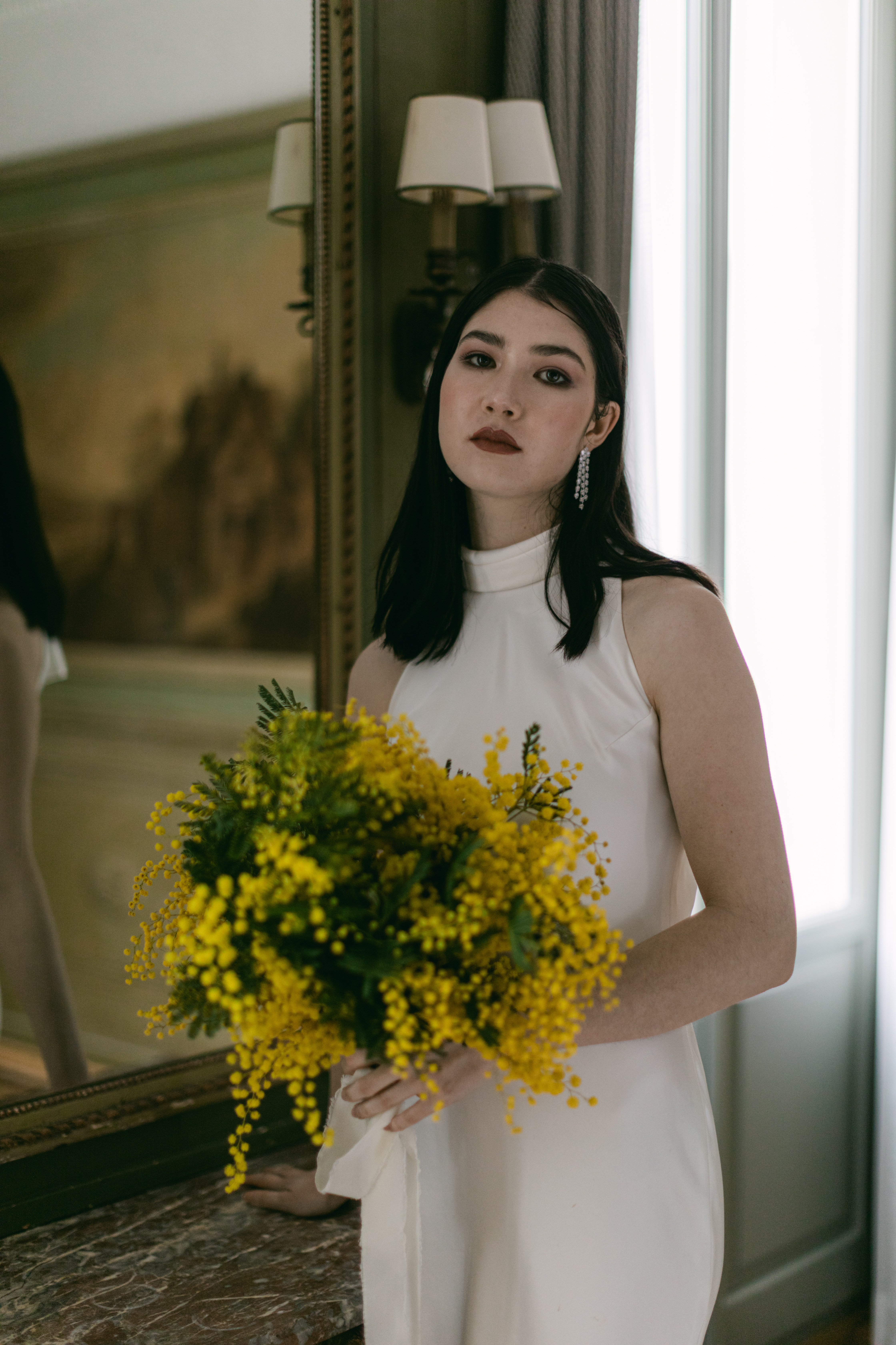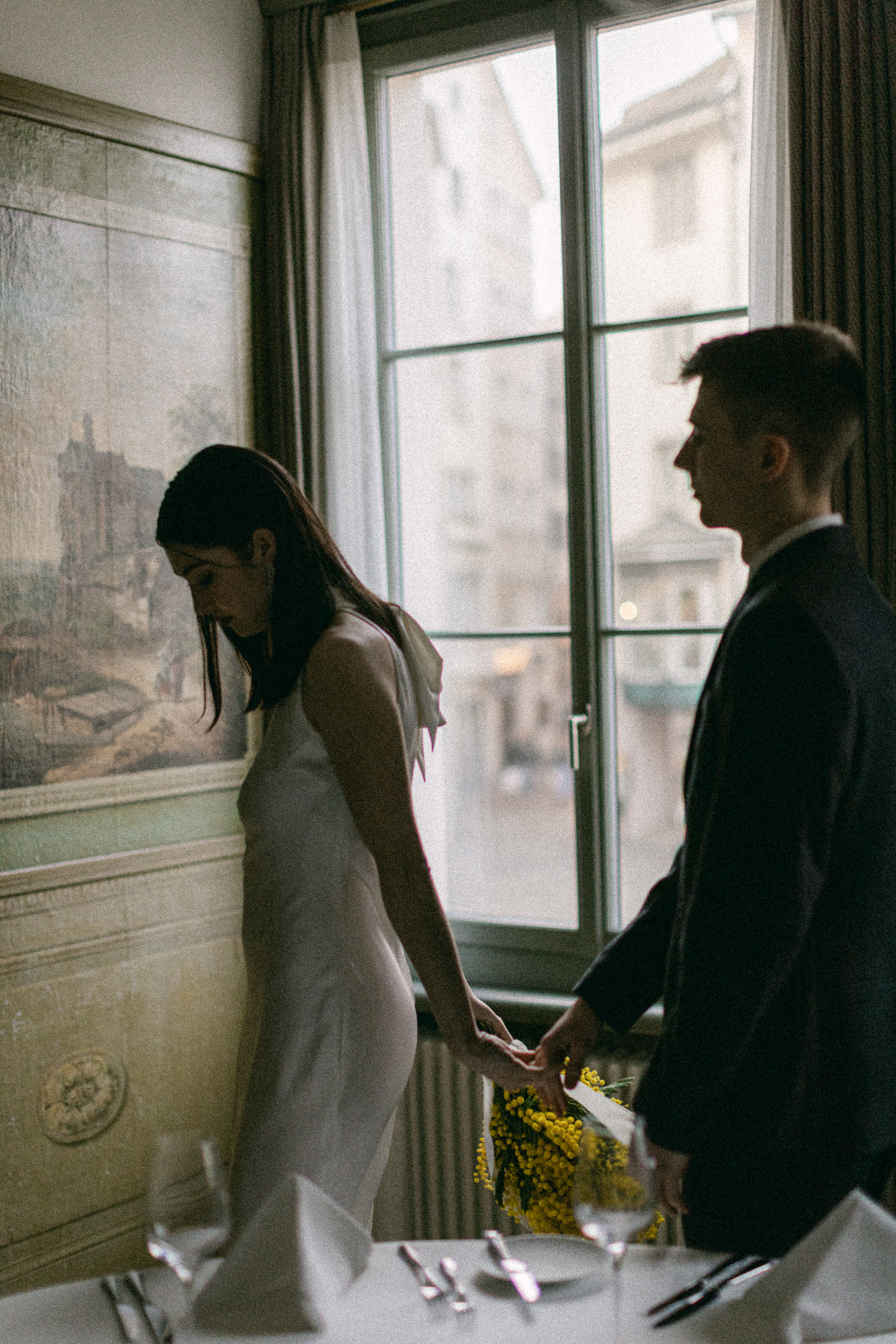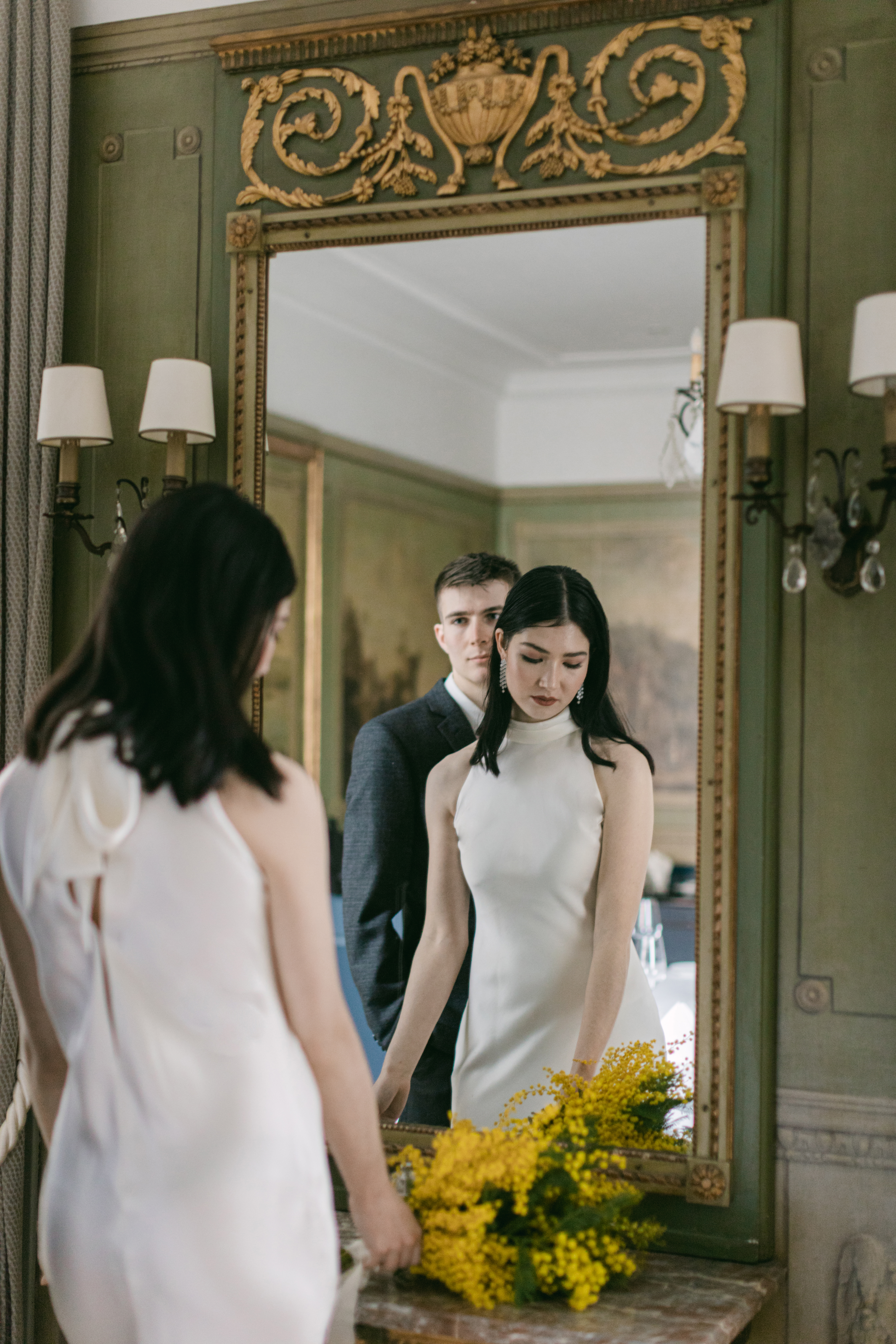 These photos were taken at the Storchen Hotel in Zurich. The hotel rooms are decorated with vintage oil paintings. February is the season for mimosa flowers. I specifically chose golden mimosas to add a pop of color to the hotel’s classic decor. The golden mimosa complements the vintage feel of the room without being too jarring. The overall atmosphere of the photos is elegant and vintage, yet full of life. I particularly like the small detail of the couple looking at themselves in the mirror.