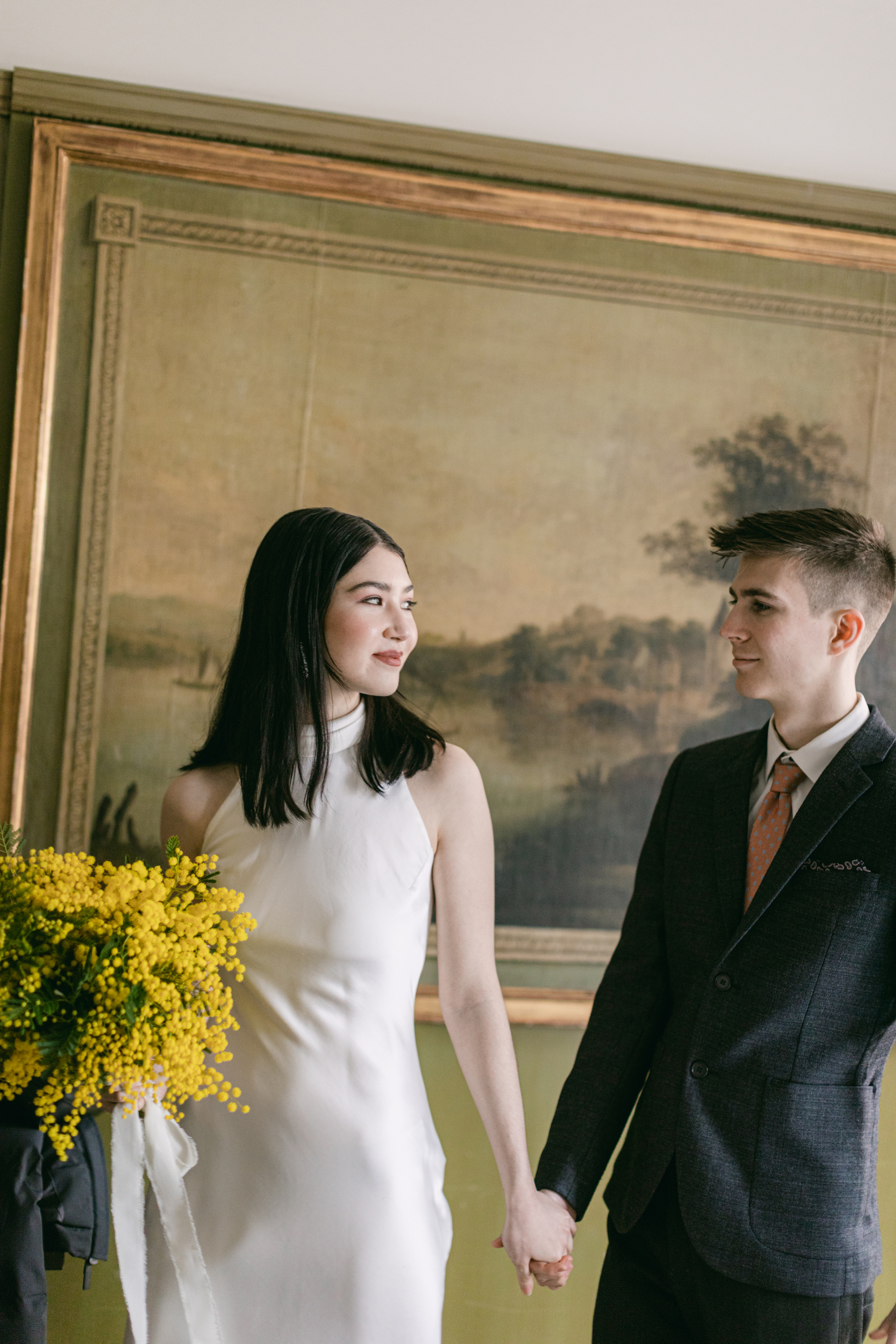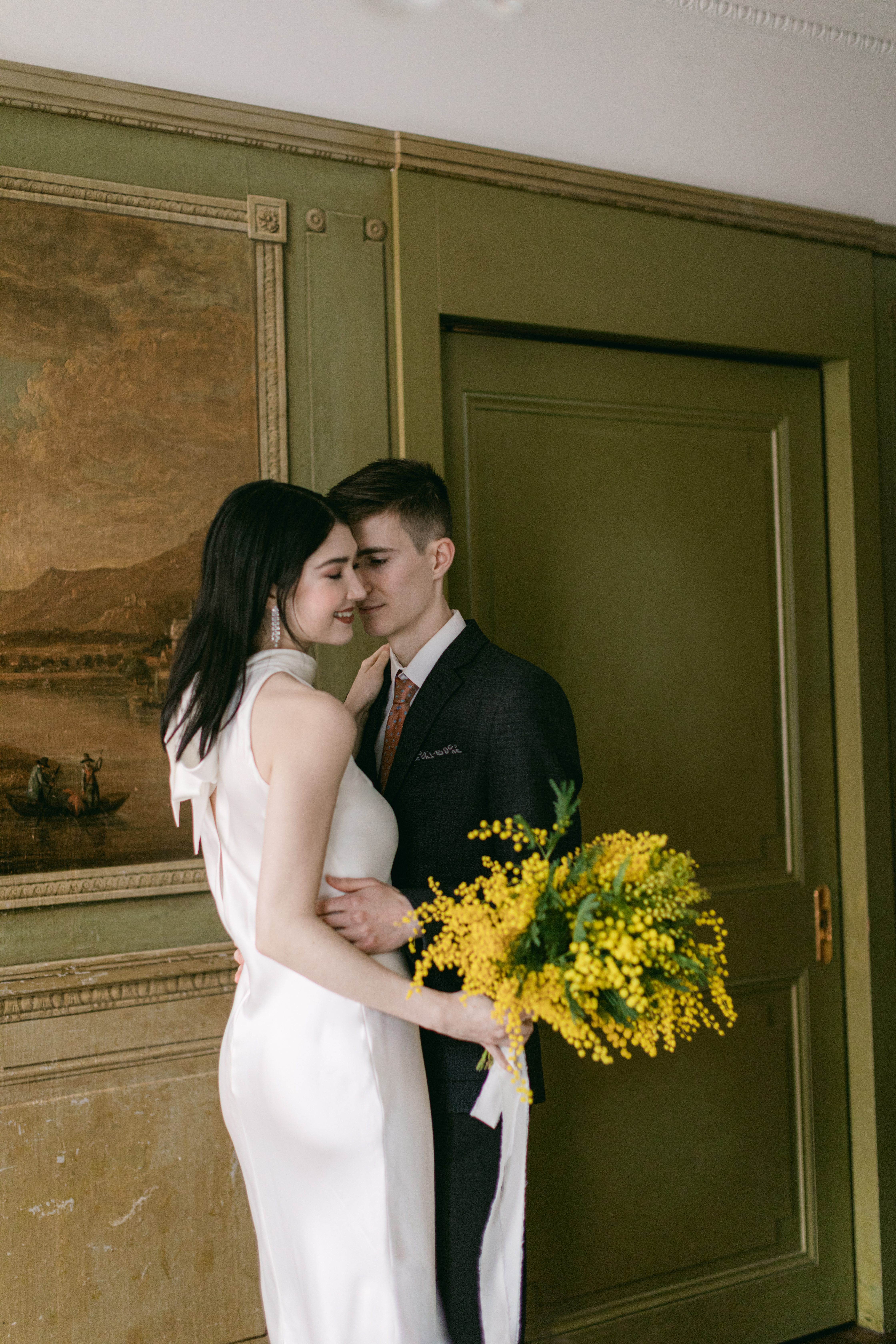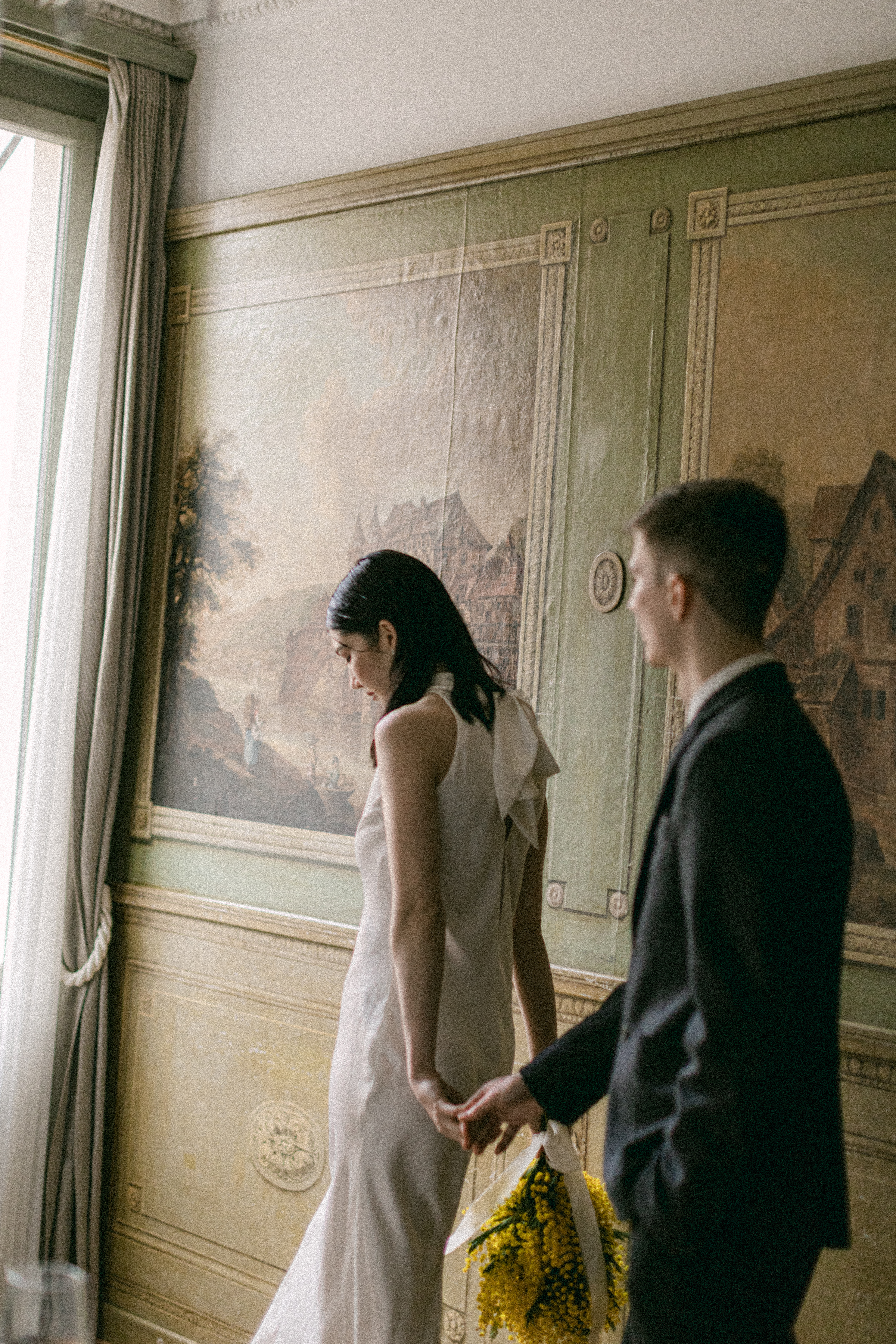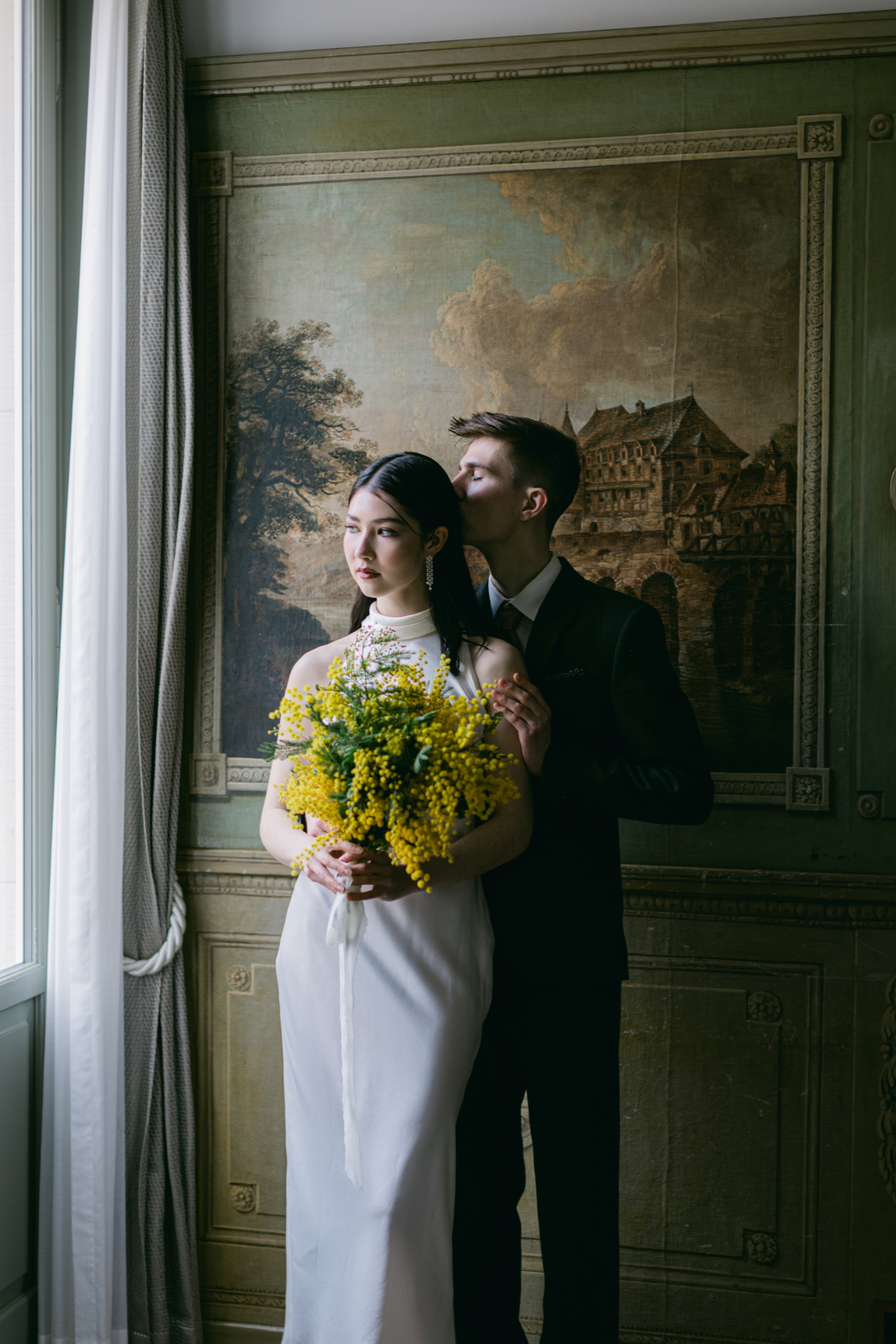These photos were taken at the Storchen Hotel in Zurich. The hotel rooms are decorated with vintage oil paintings. February is the season for mimosa flowers. I specifically chose golden mimosas to add a pop of color to the hotel’s classic decor. The golden mimosa complements the vintage feel of the room without being too jarring. The overall atmosphere of the photos is elegant and vintage, yet full of life. I particularly like the small detail of the couple looking at themselves in the mirror.