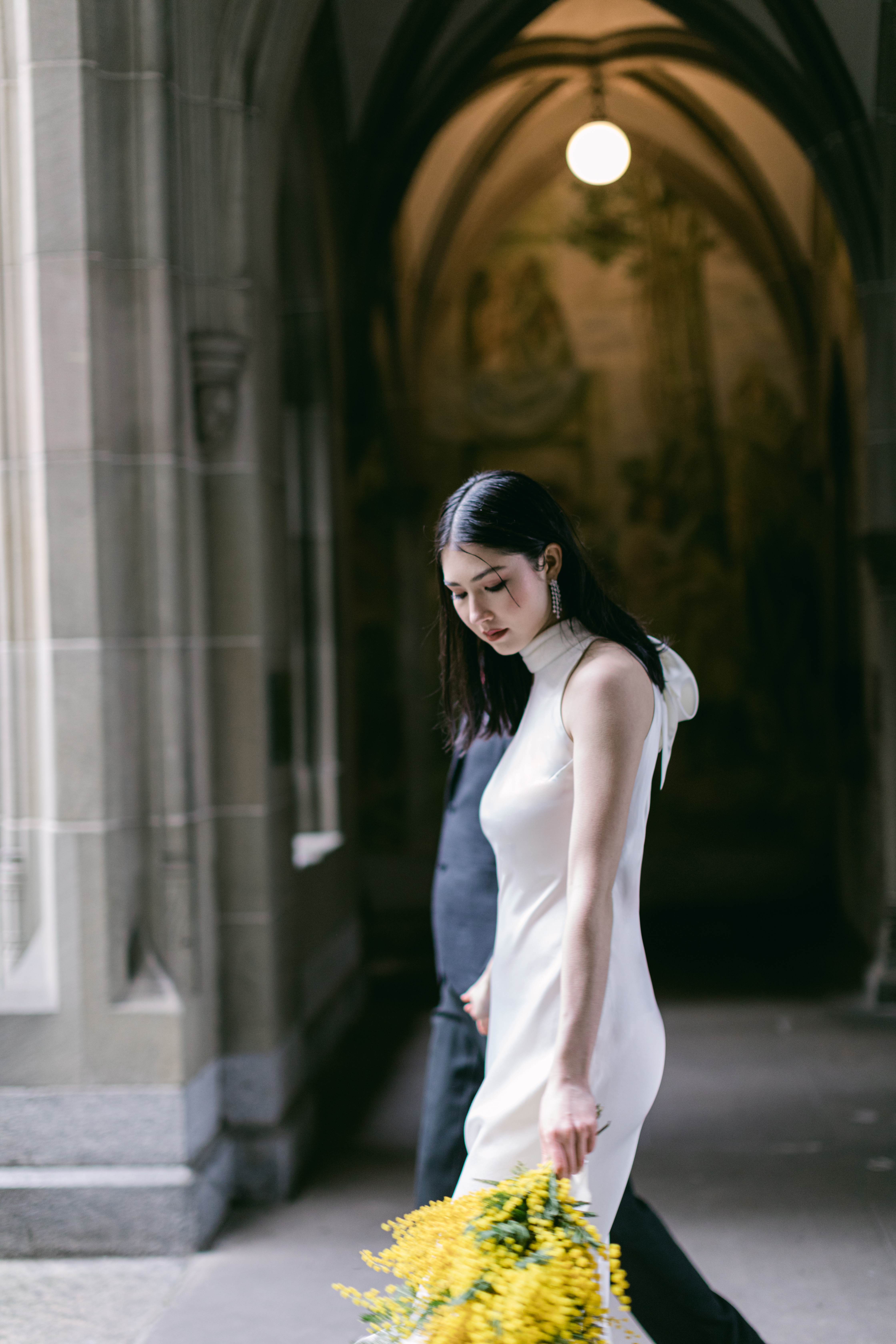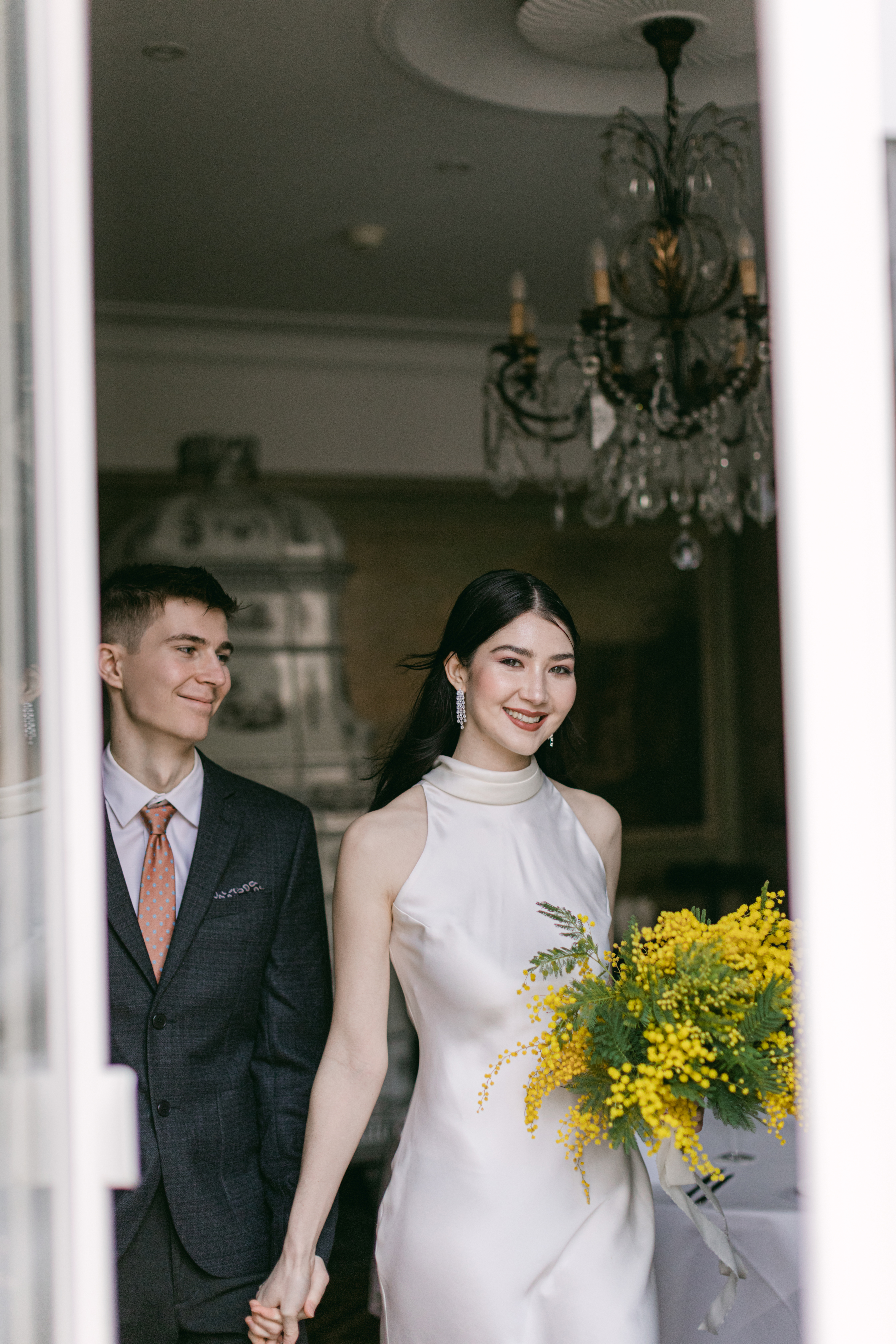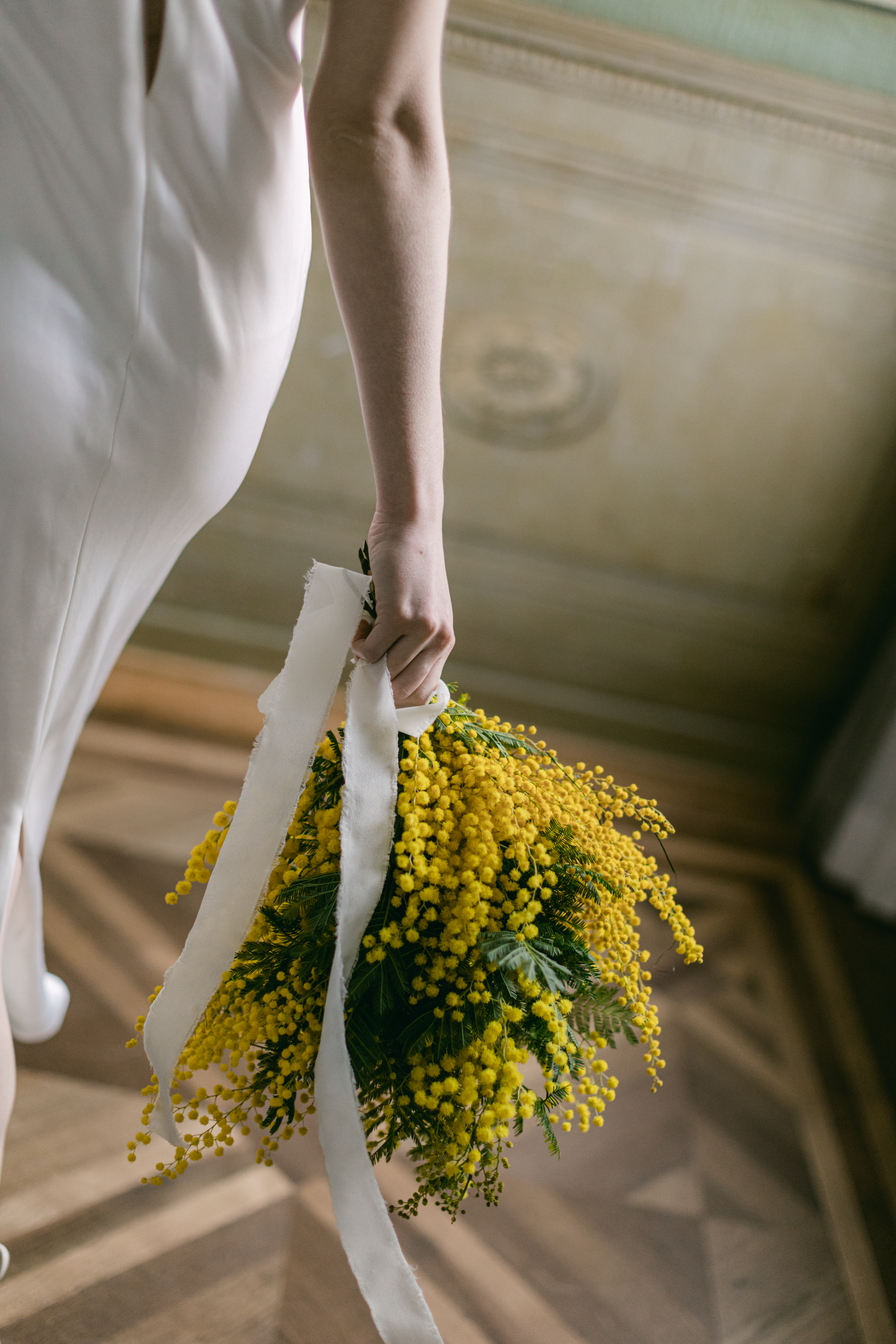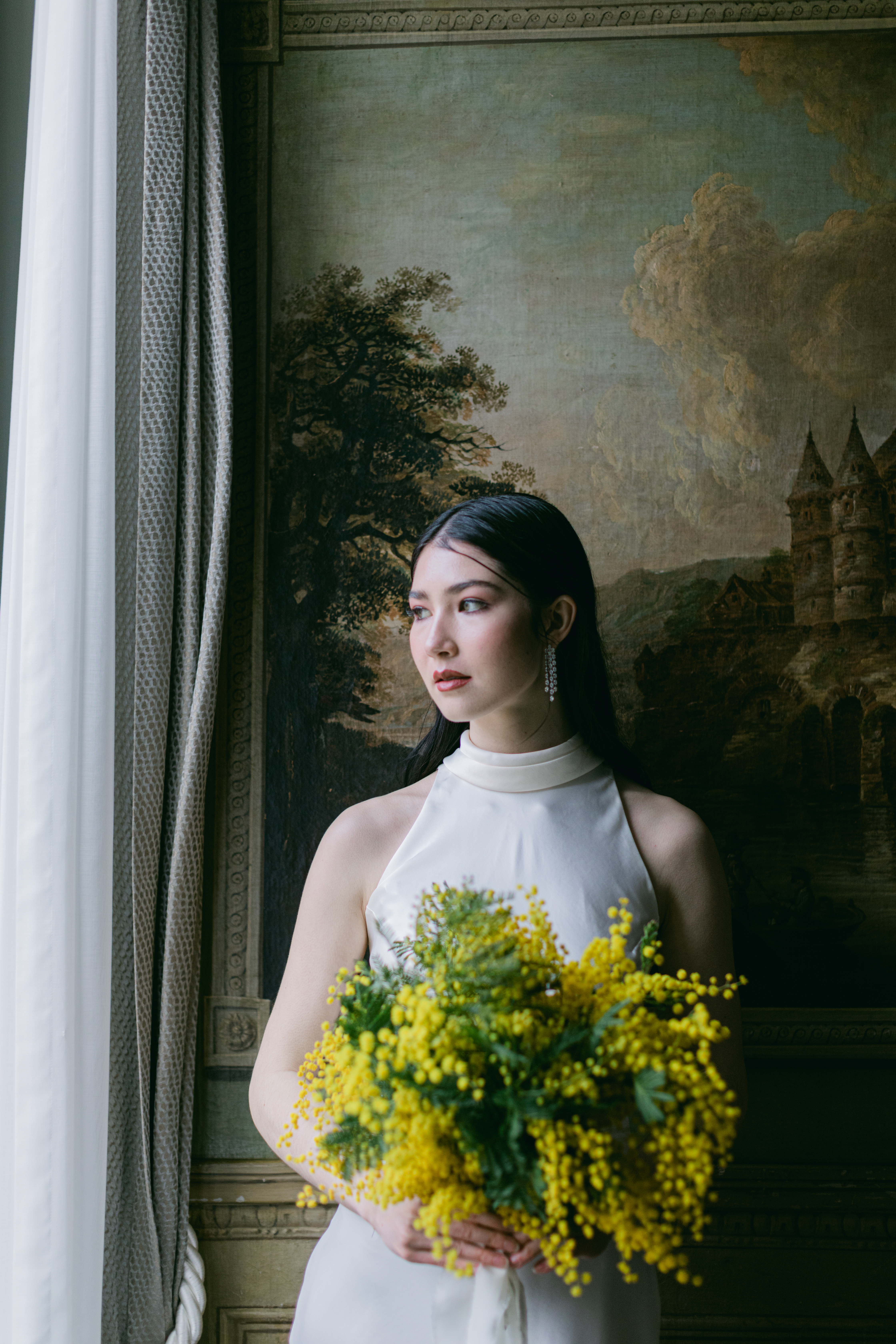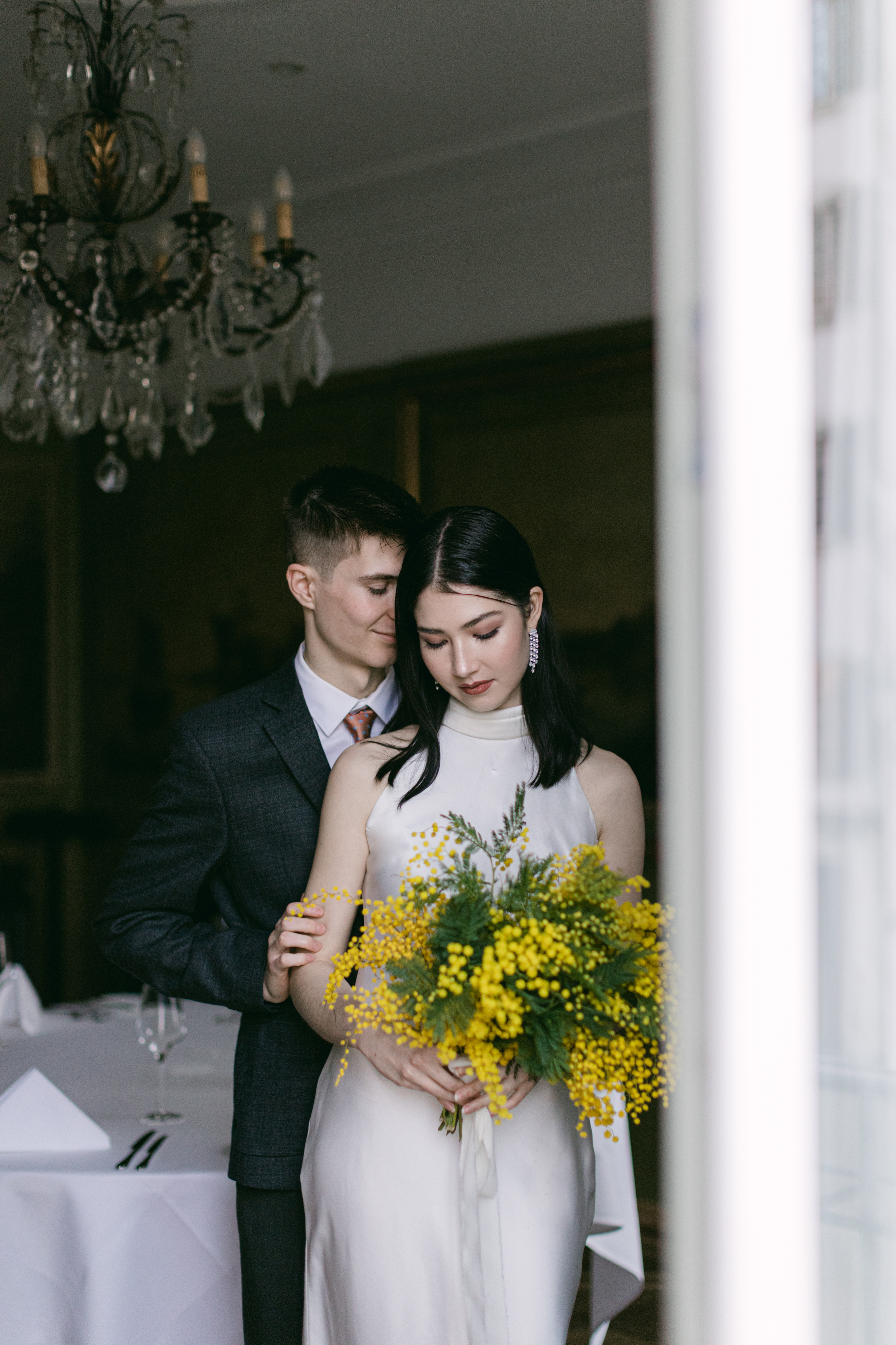 These photos were taken at the Storchen Hotel in Zurich. The hotel rooms are decorated with vintage oil paintings. February is the season for mimosa flowers. I specifically chose golden mimosas to add a pop of color to the hotel’s classic decor. The golden mimosa complements the vintage feel of the room without being too jarring. The overall atmosphere of the photos is elegant and vintage, yet full of life. I particularly like the small detail of the couple looking at themselves in the mirror.