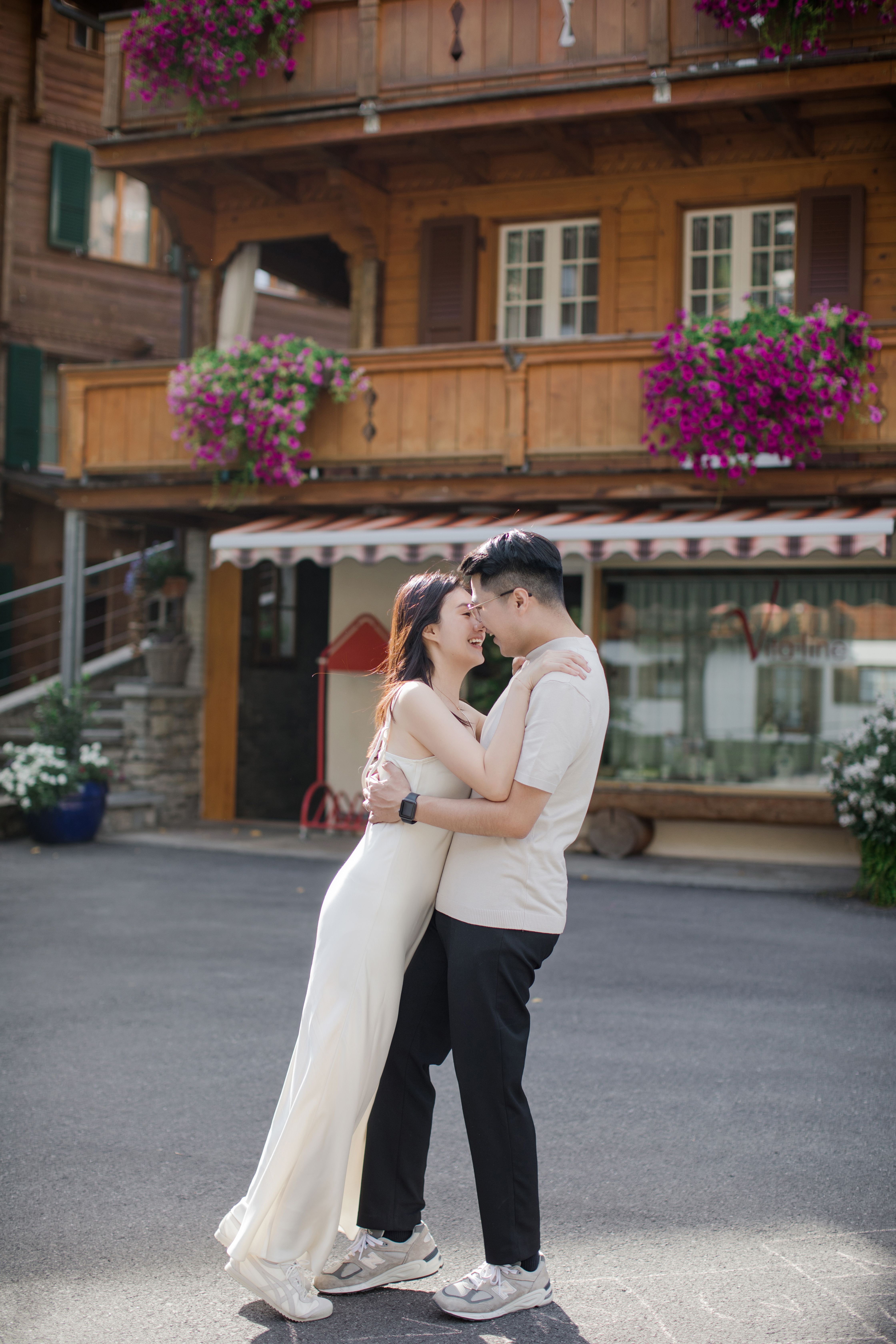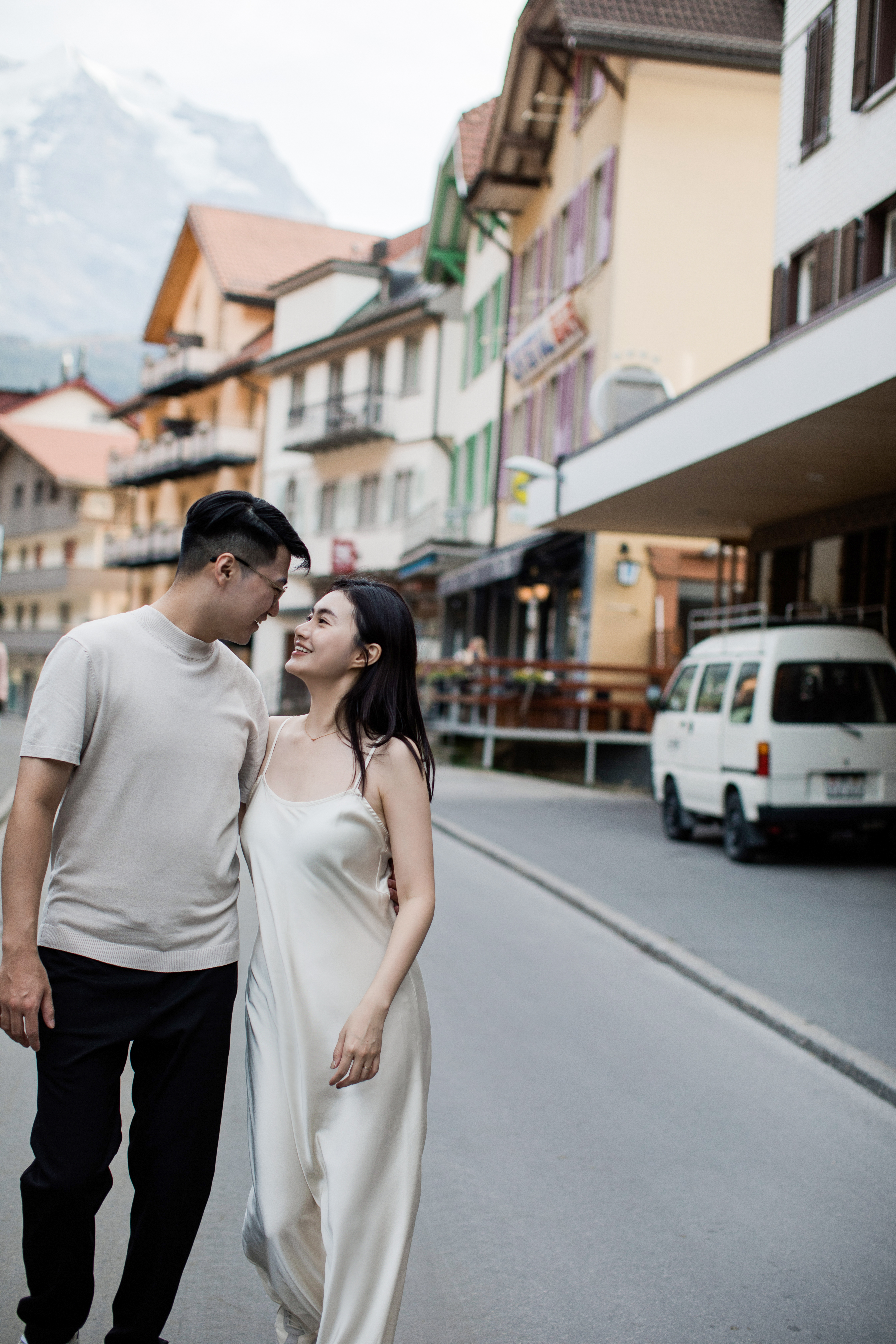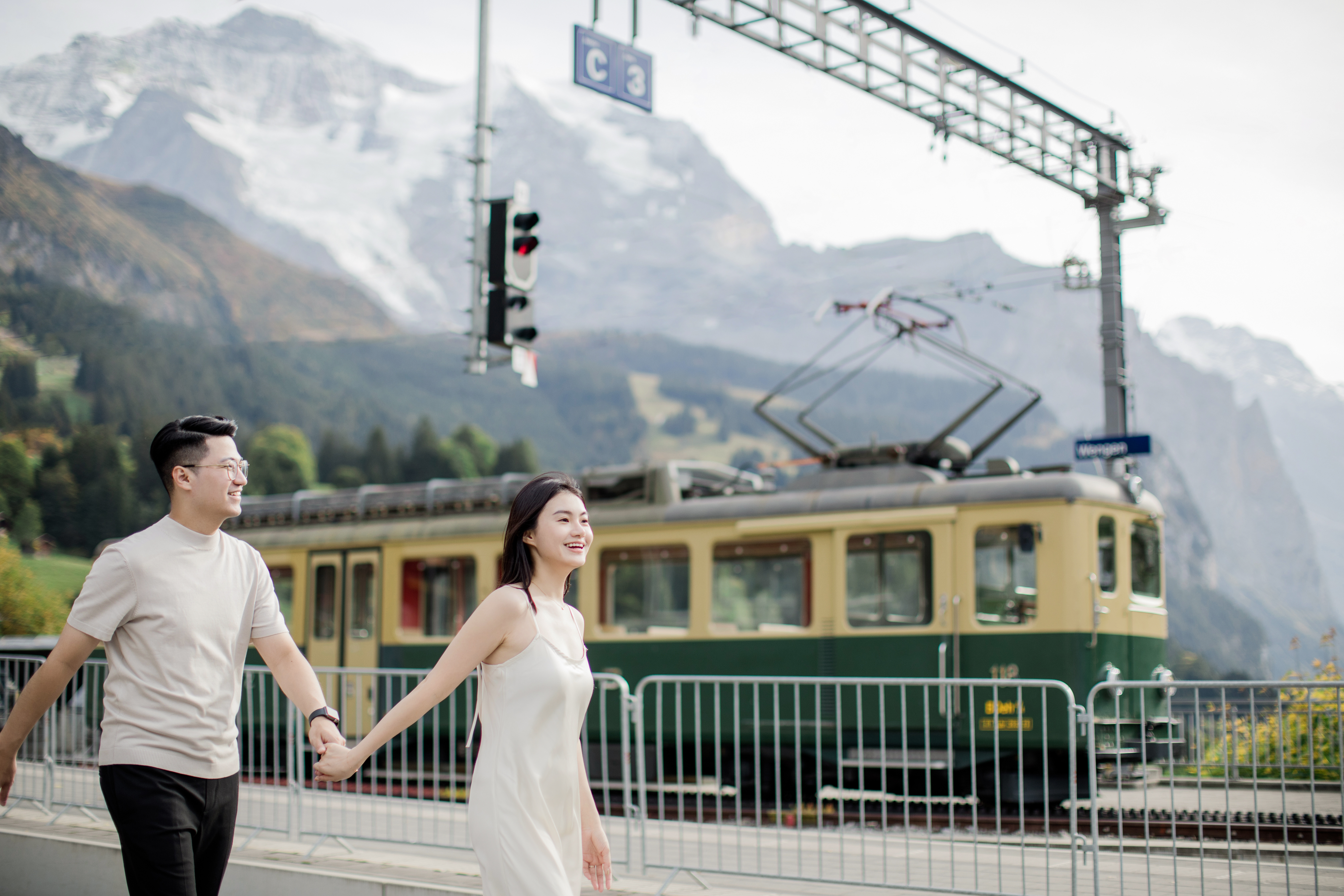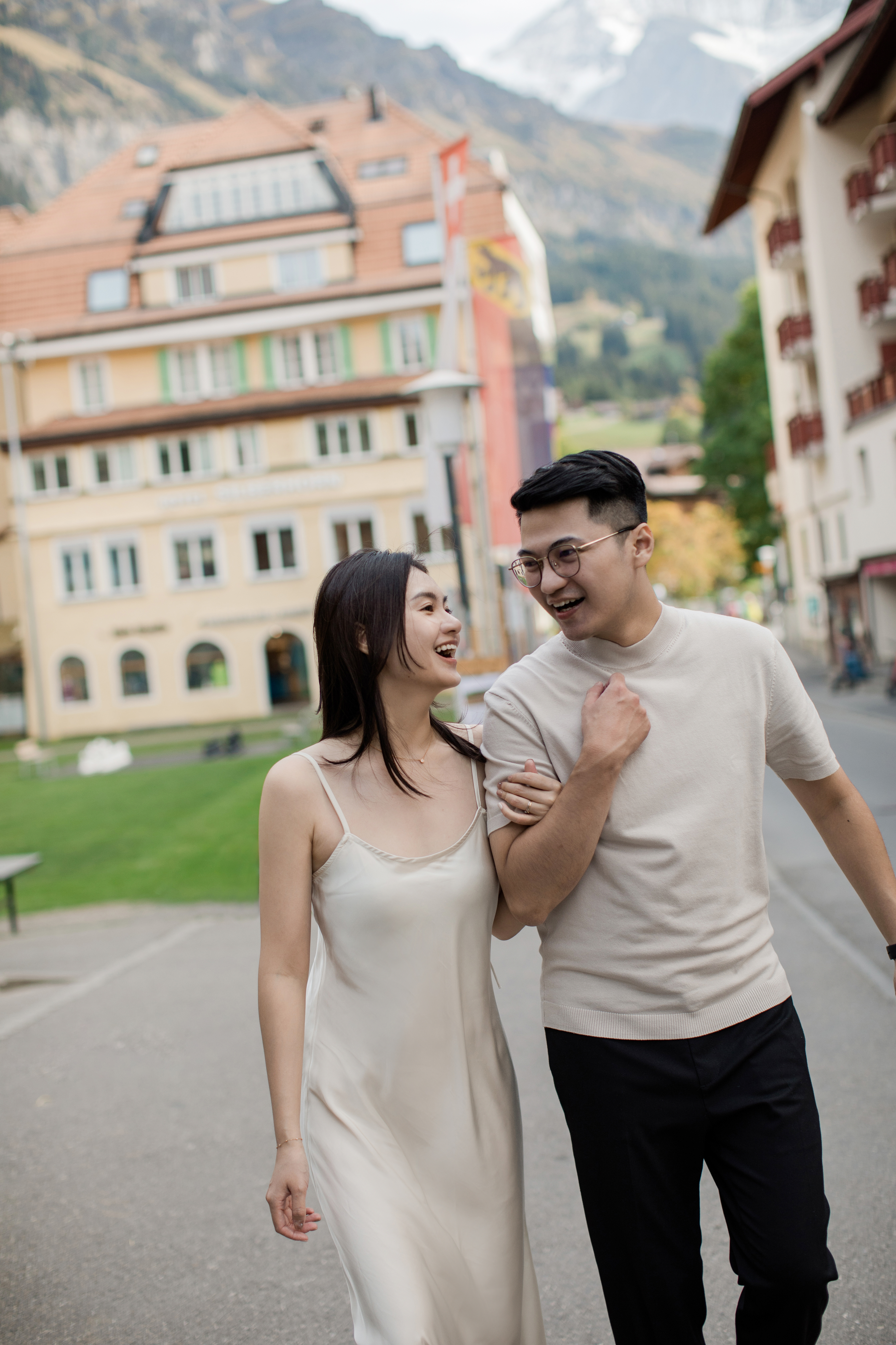 For this shoot, we captured a lovely Taiwanese couple on their journey from Wengen to Kleine Scheidegg. We met them in Wengen and started our session by exploring the charming town. I particularly loved the paths that offered stunning views of the Jungfrau. I guided them through some simple poses to capture their natural interactions. They were so easygoing, and their photos perfectly complemented the warm autumn sunlight.
