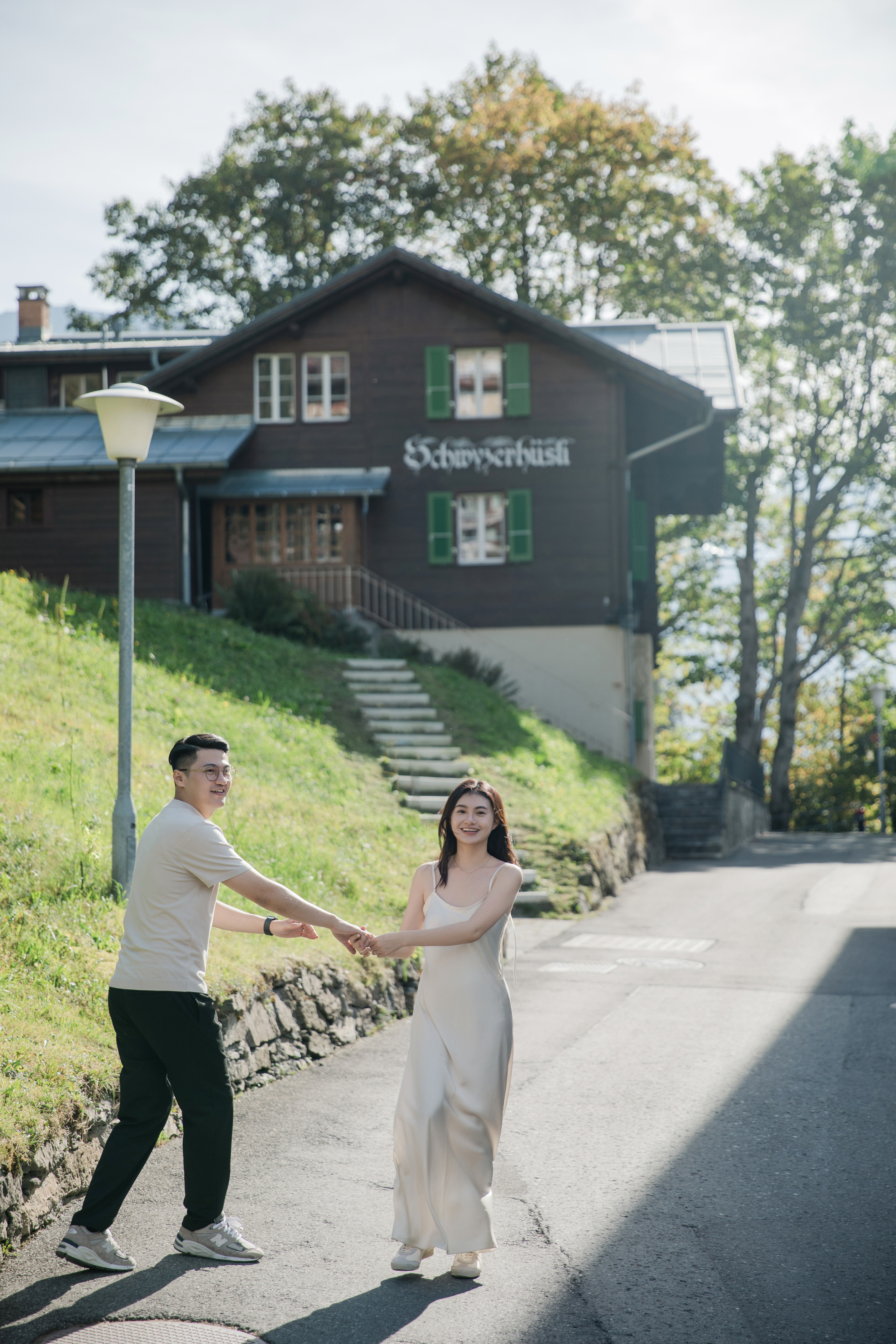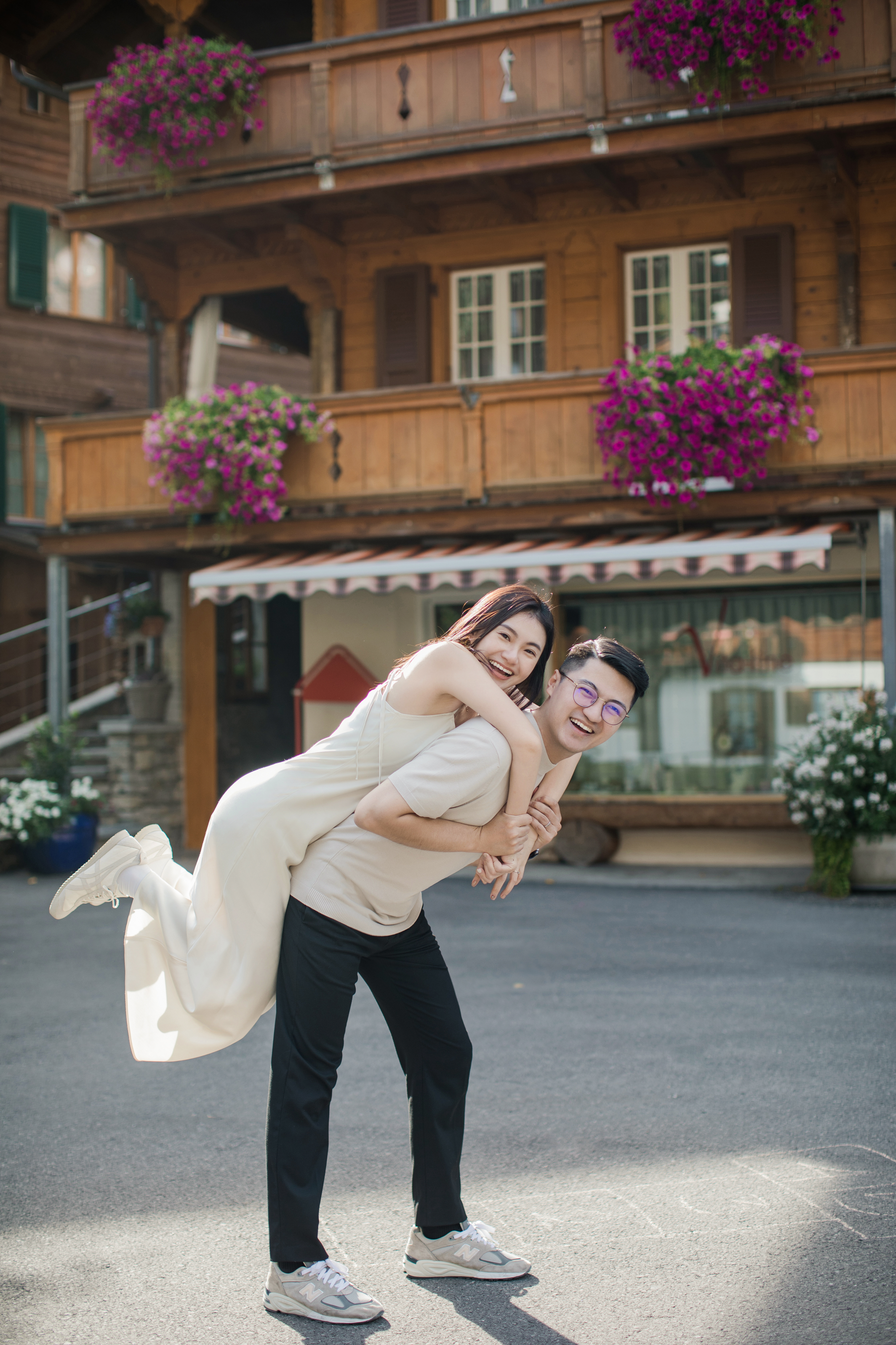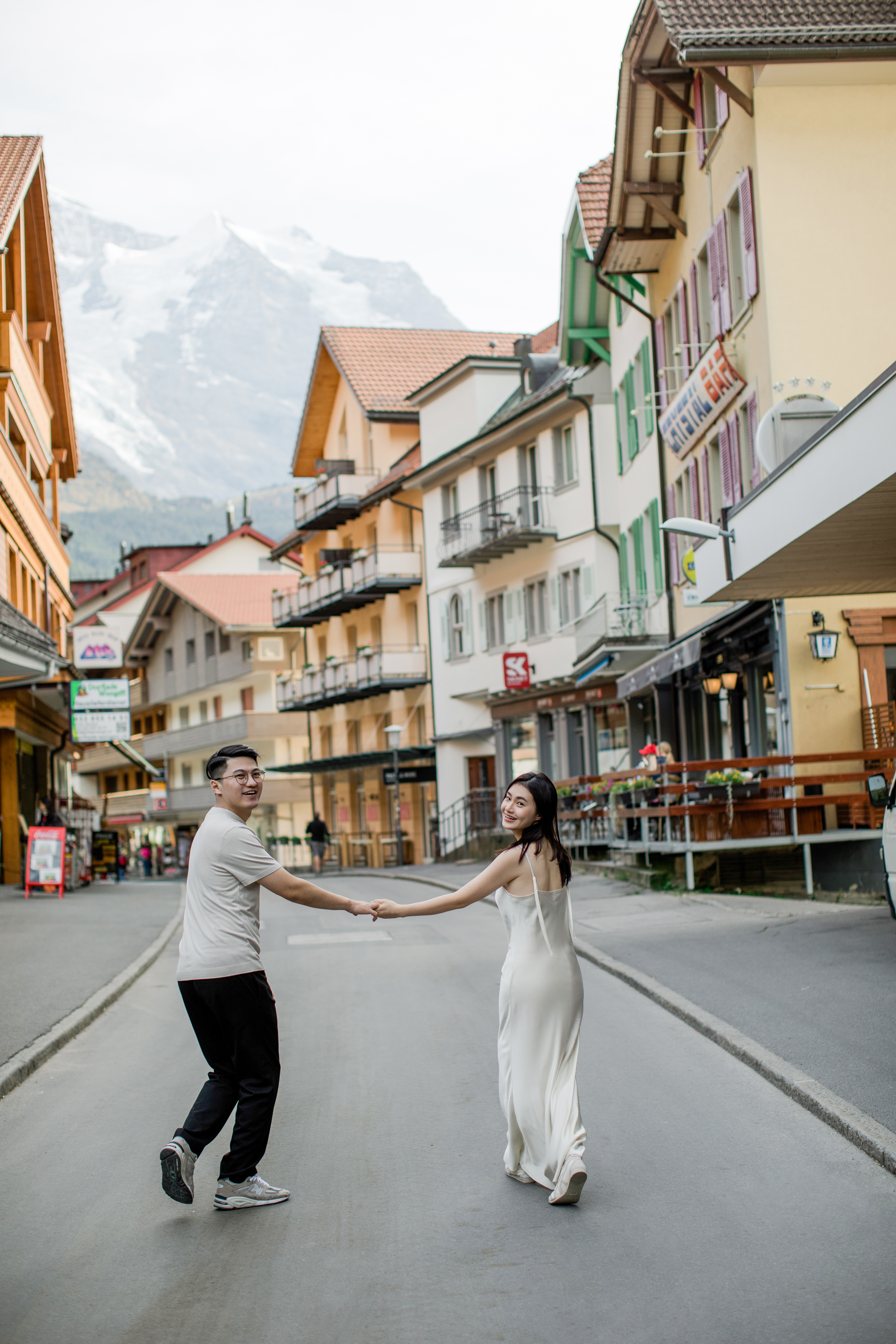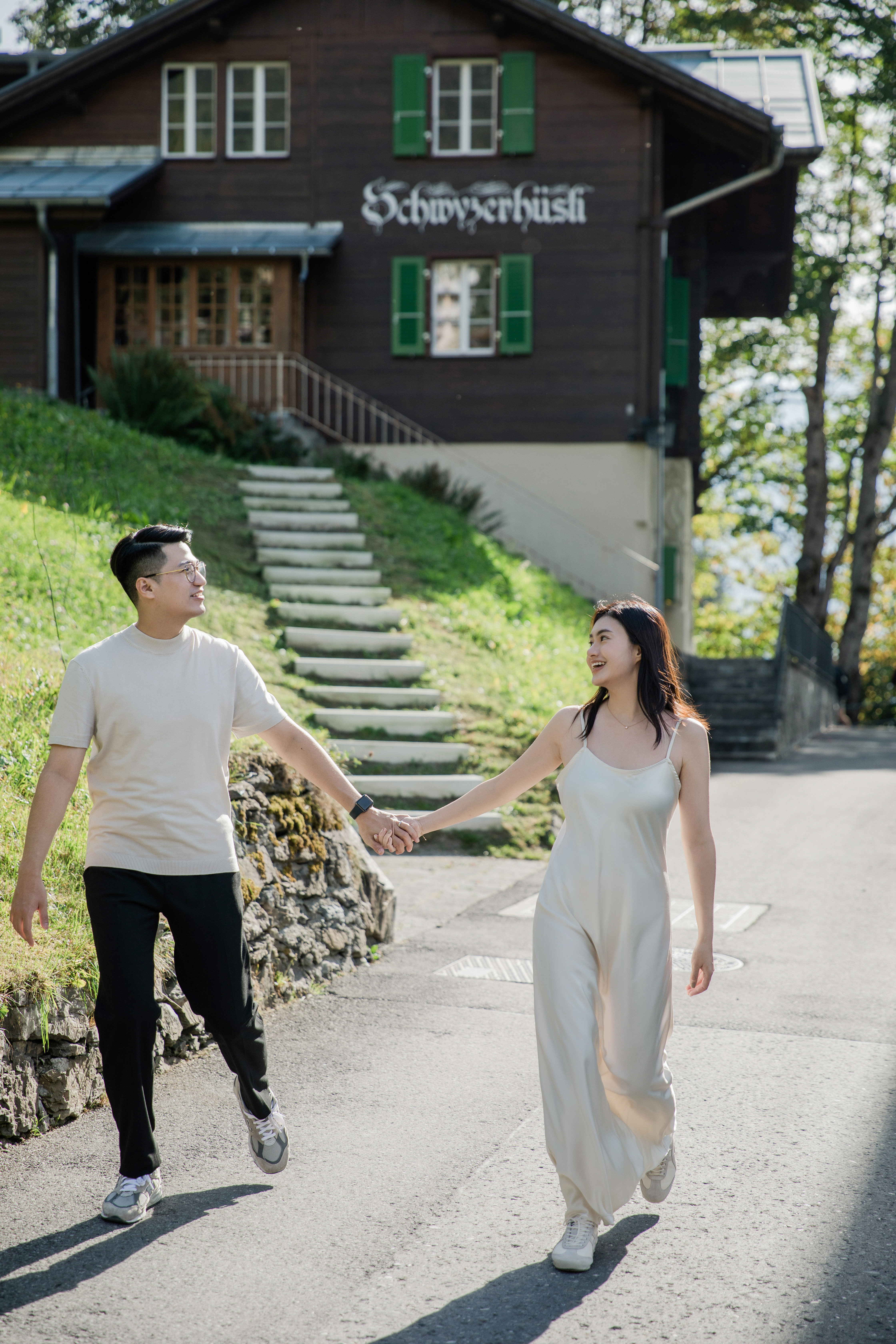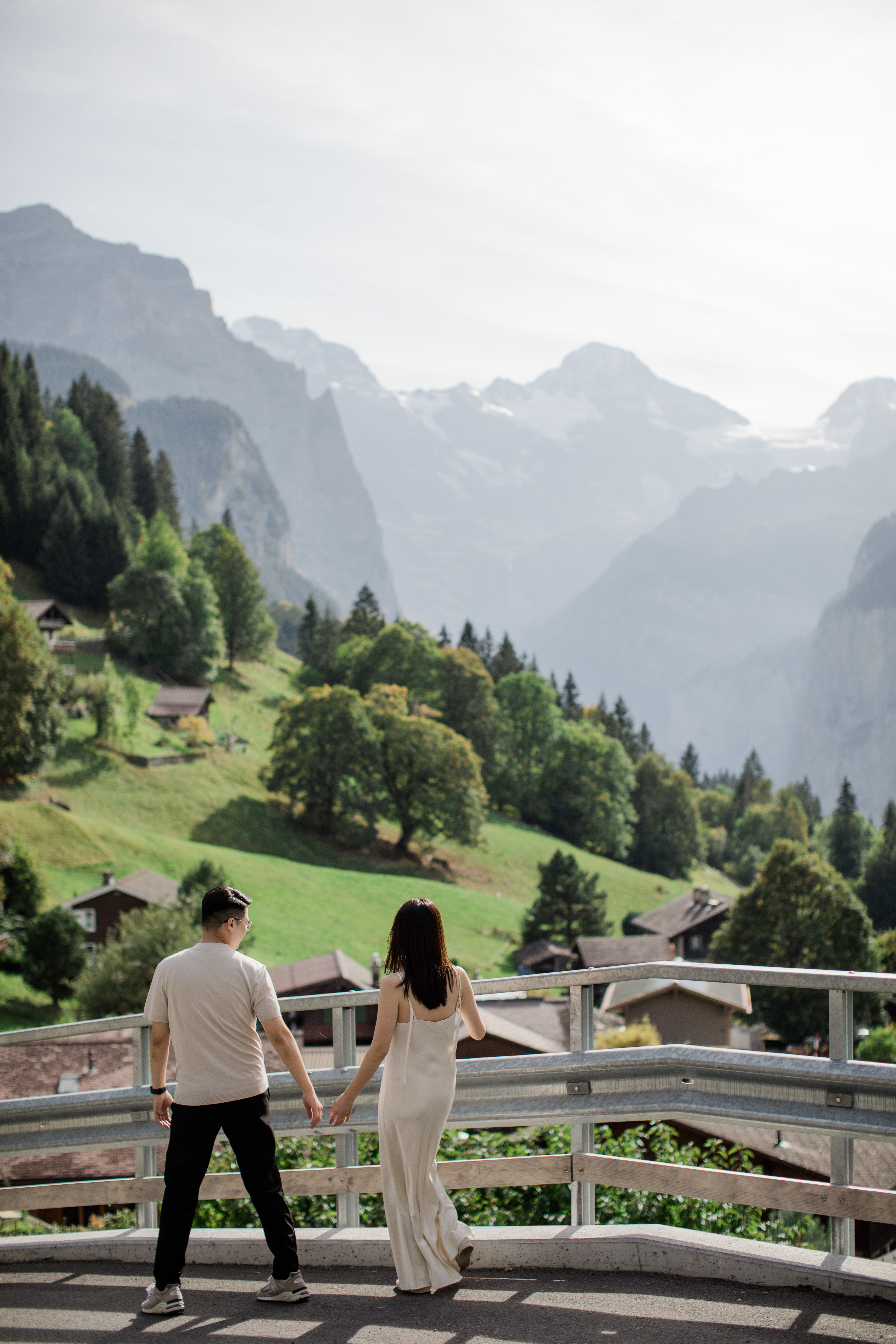 For this shoot, we captured a lovely Taiwanese couple on their journey from Wengen to Kleine Scheidegg. We met them in Wengen and started our session by exploring the charming town. I particularly loved the paths that offered stunning views of the Jungfrau. I guided them through some simple poses to capture their natural interactions. They were so easygoing, and their photos perfectly complemented the warm autumn sunlight.