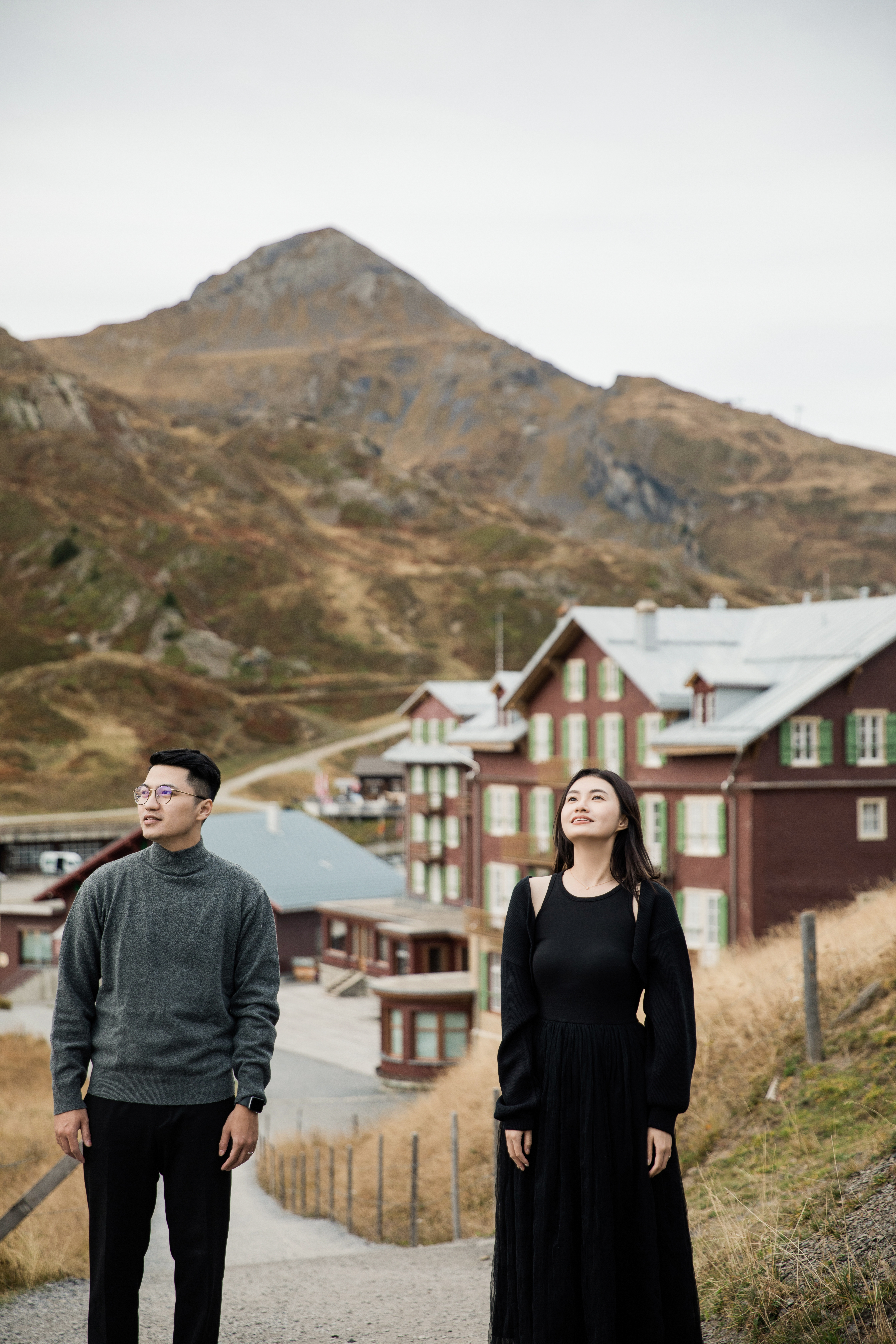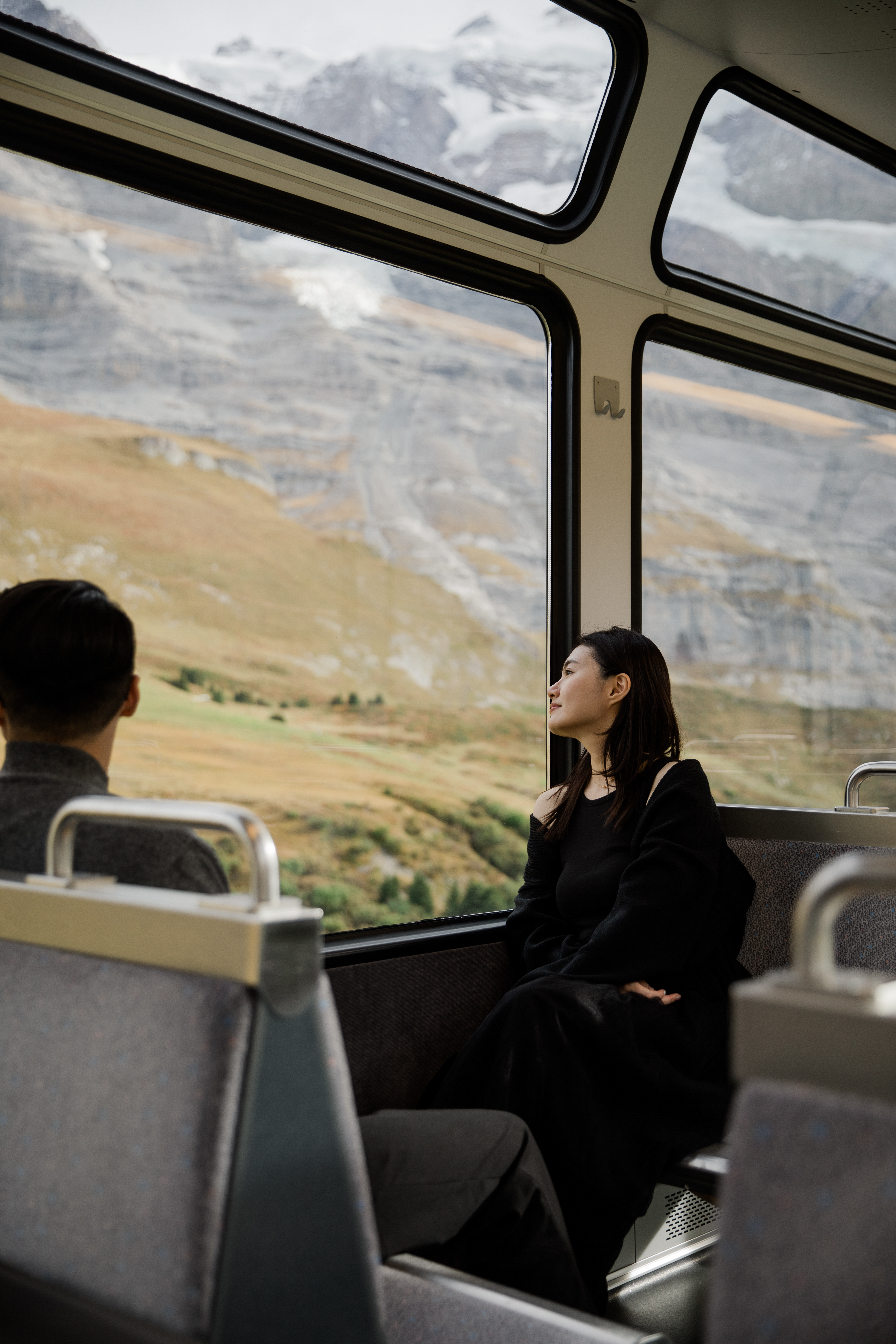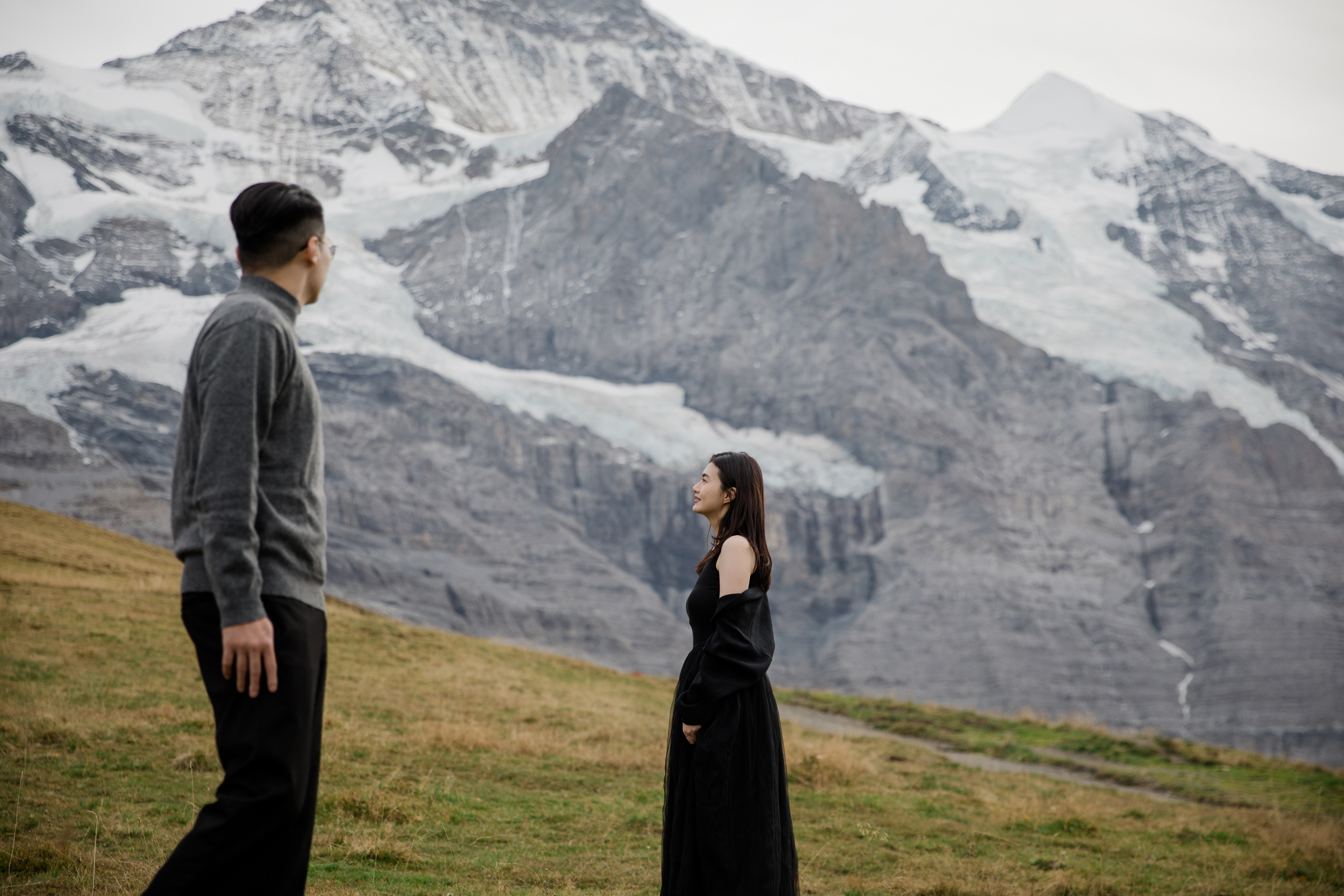 After Wengen, we took the train to Kleine Scheidegg. She had changed into a beautiful black dress, and they had both put a lot of thought into their outfits for the shoot. The train ride to Jungfrau offered impressive mountain views. When we were shooting at Kleine Scheidegg, she wanted to recreate a scene from the Korean drama “Crash Landing on You.” We actually managed to capture it! They were so happy with the unique photos and it became a special memory of their trip to Switzerland.