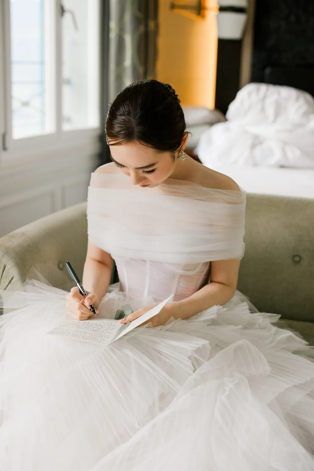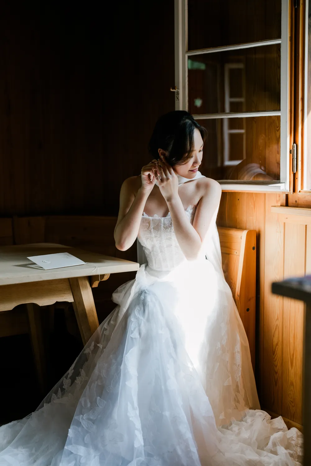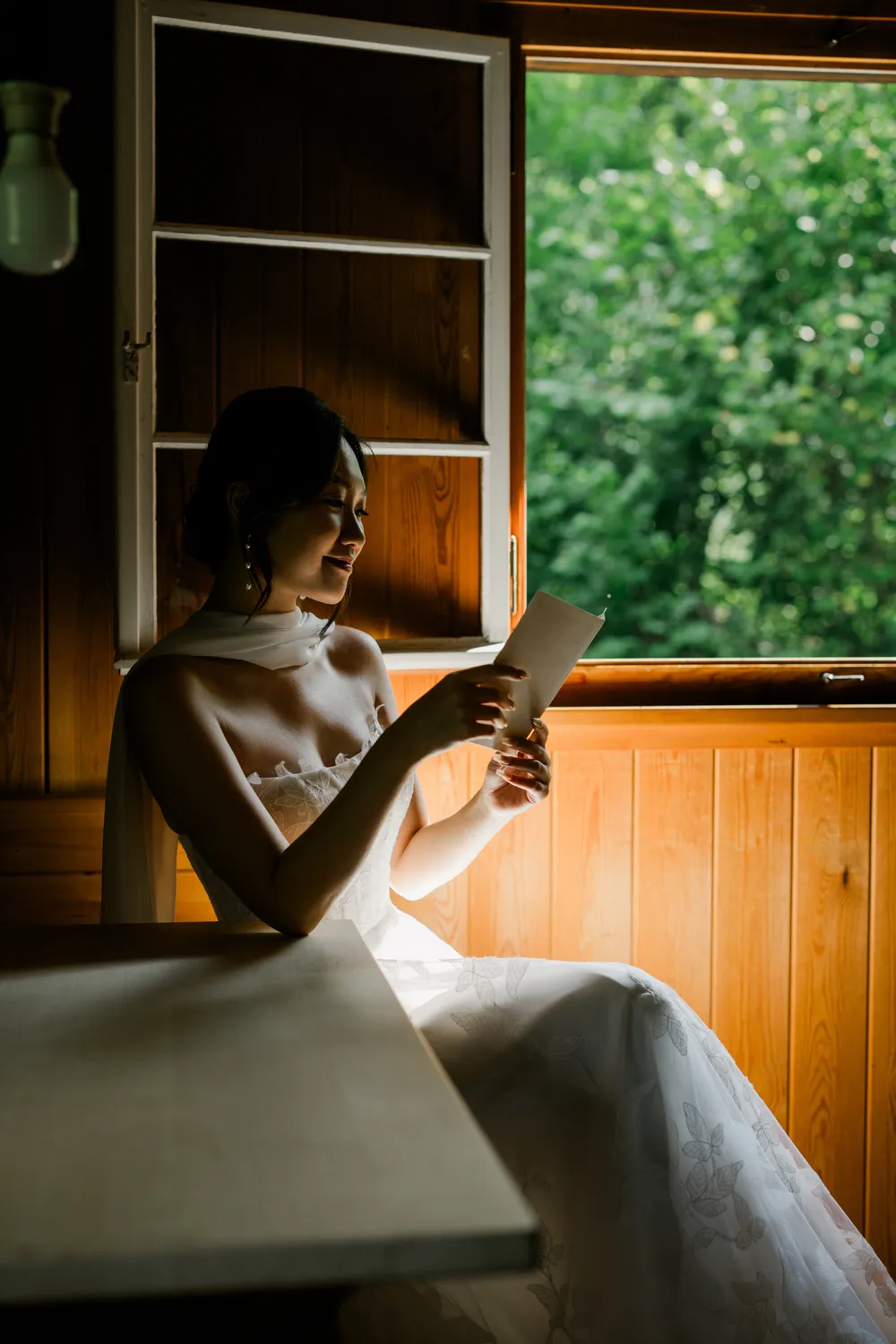 The bride brought with her the chic, fast-paced energy of Hong Kong, yet as she sat by the window, everything seemed to slow down. The sunlight sliced through the room, casting deep, poetic shadows. Watching her read her vows (Image 7) felt like witnessing a moment of profound peace after a long journey. From the silhouette of her putting on earrings (Image 8) to the intricate lace of her gown, it wasn’t just a preparation—it was a soulful immersion into the day.